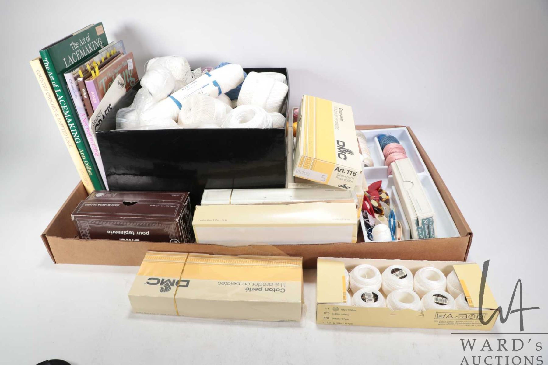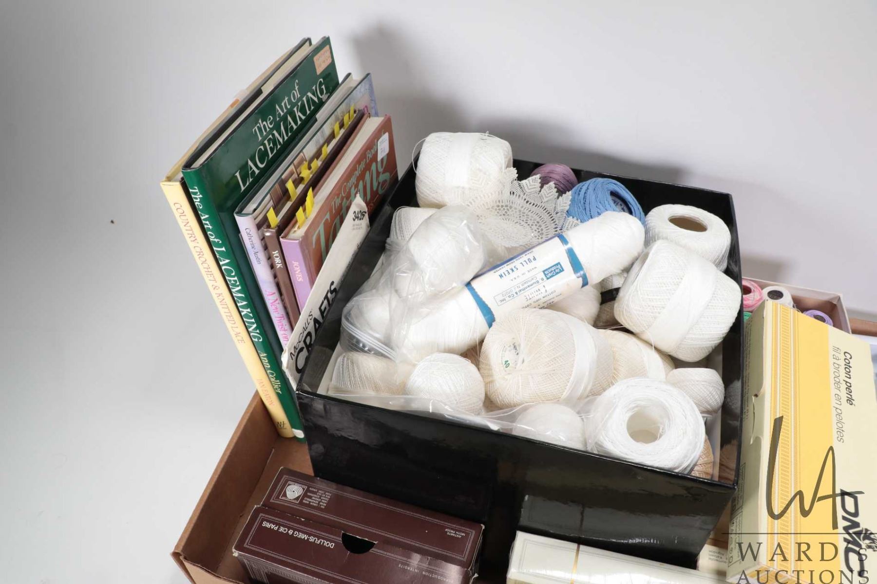 Large selection of lace making supplies including DMC embroidery cotton plus selection of lace making/ tatting instructions books and patterns and tatting shuttles etc.