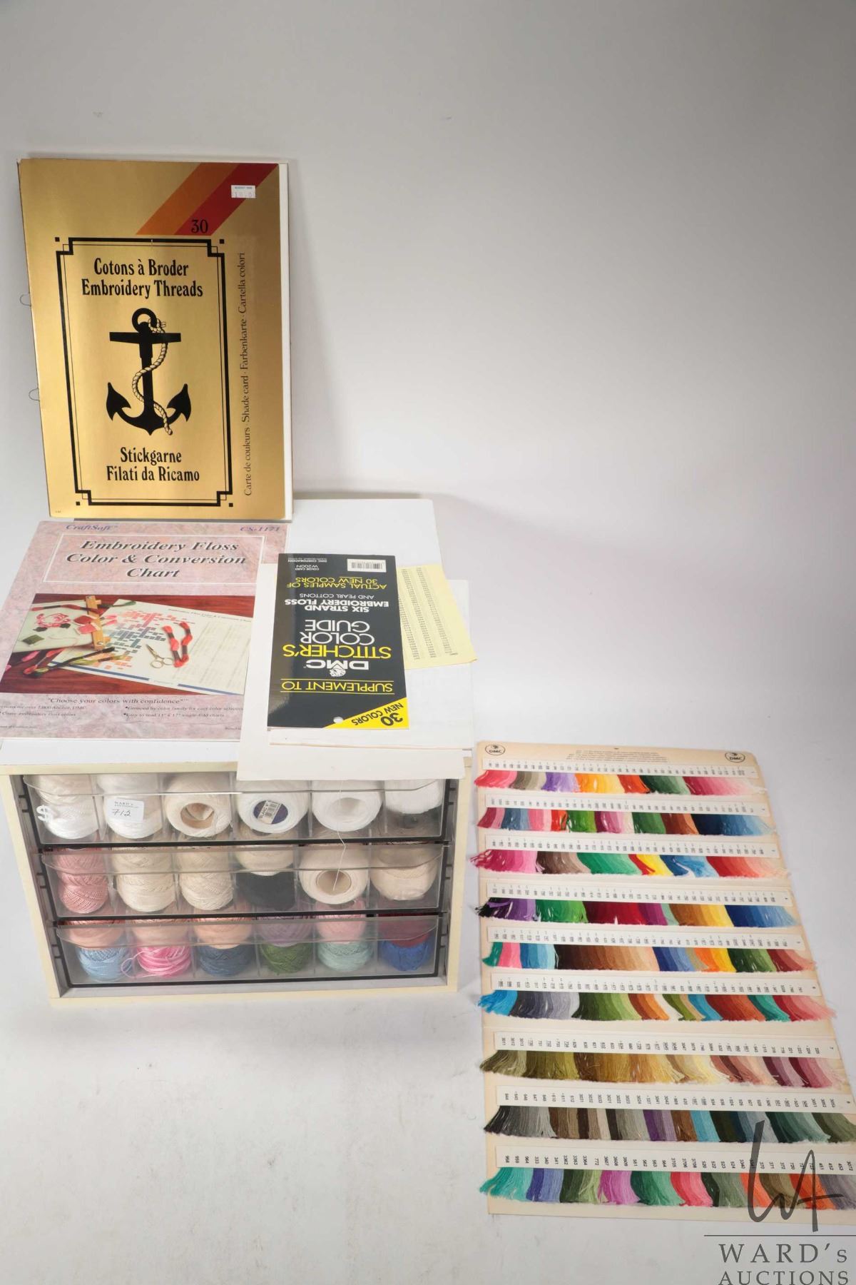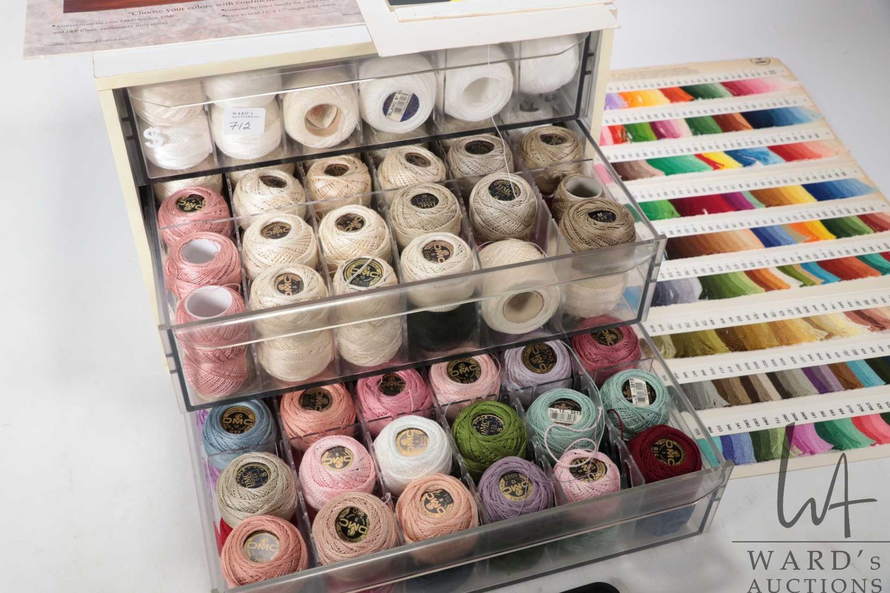 Lot 712 DMC Cotton Perle three drawer cabinet filled with a large selection of DMC Cotton Perle embroidery t