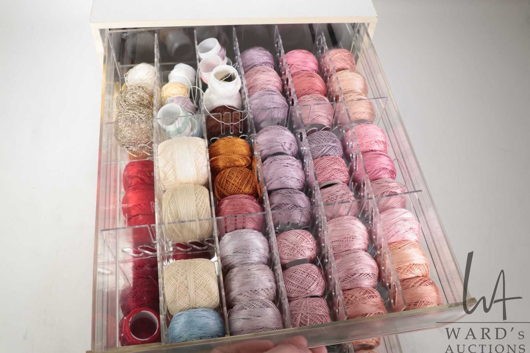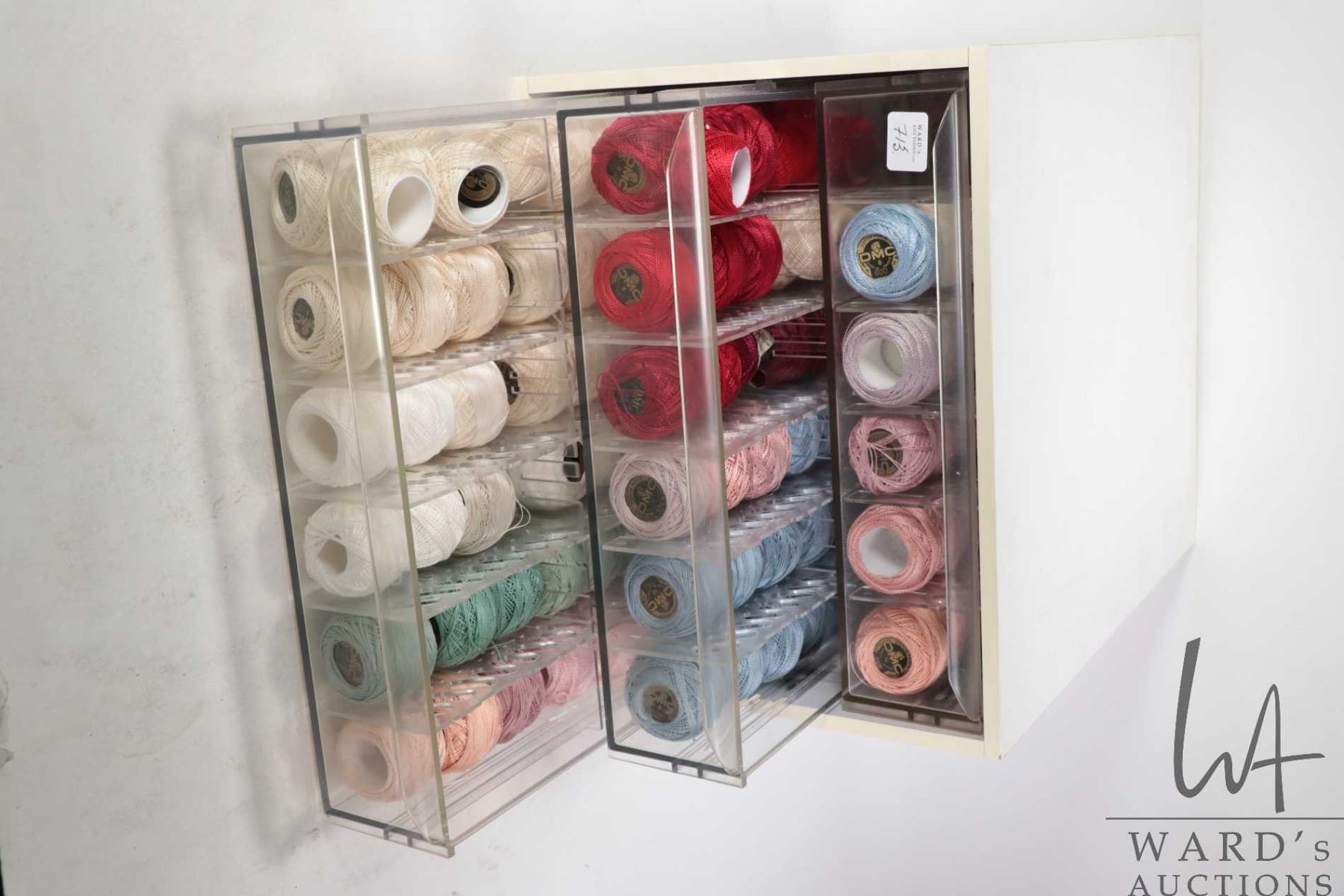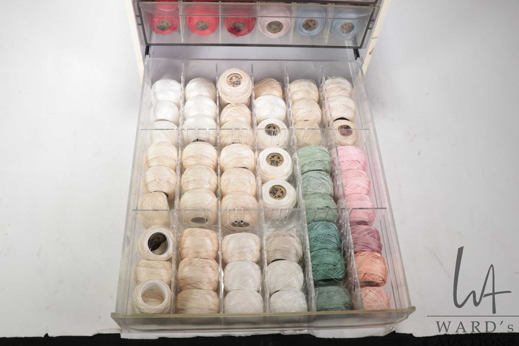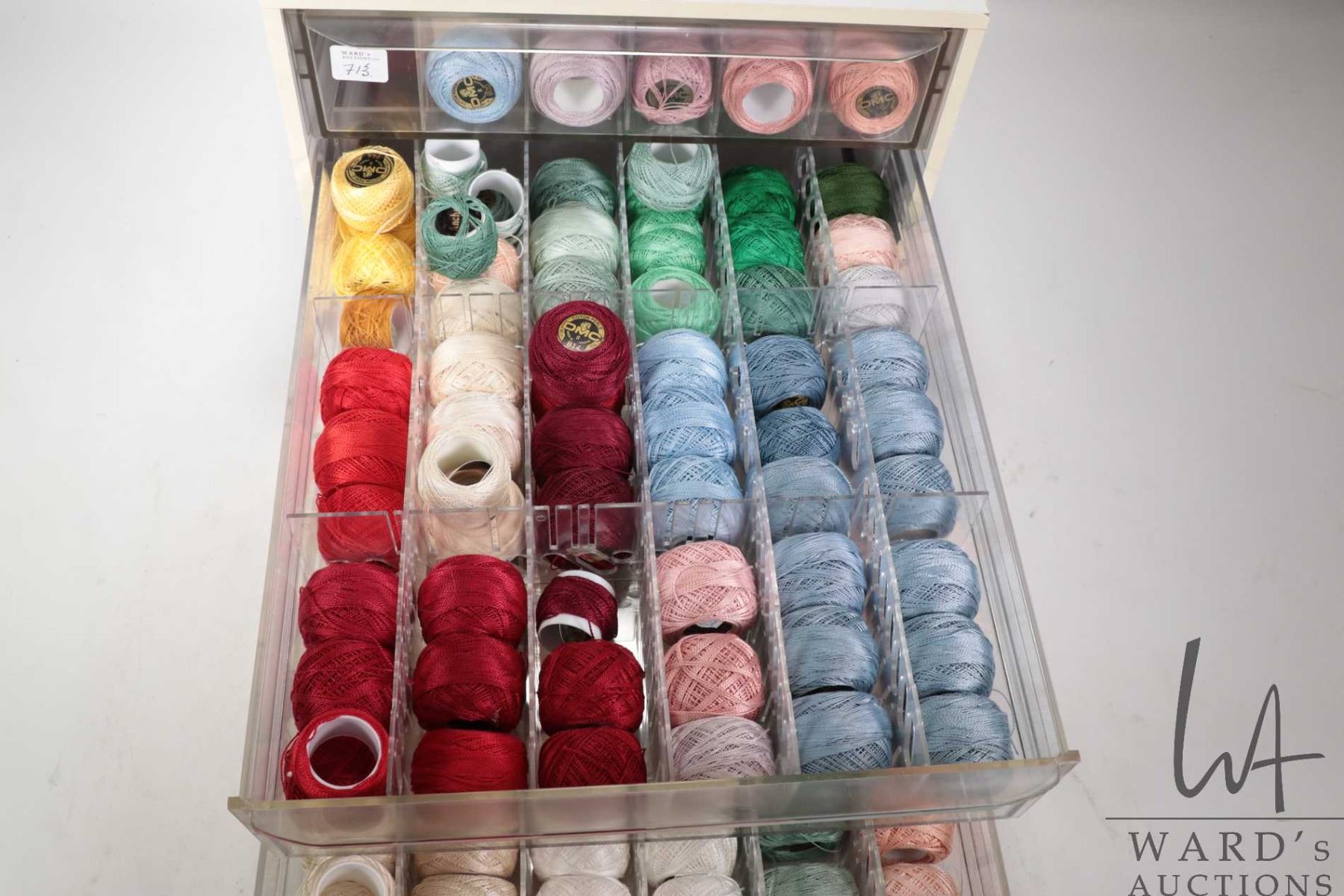 Lot 713 DMC Cotton Perle three drawer cabinet filled with a large selection of DMC Cotton Perle embroidery t