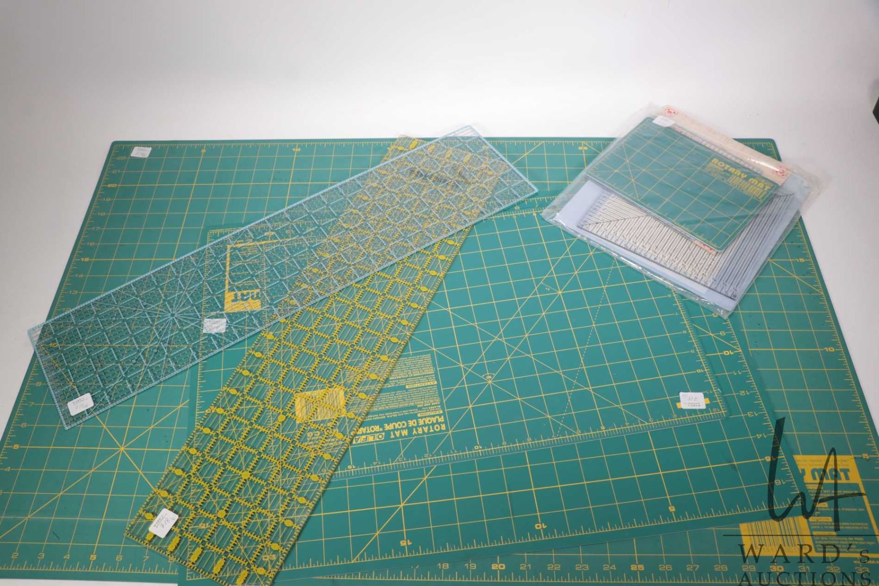Selection of self healing rotary cutting mats including 35" X 24", 18" X 12", 23" X 17" plus a selection of bias squares etc.