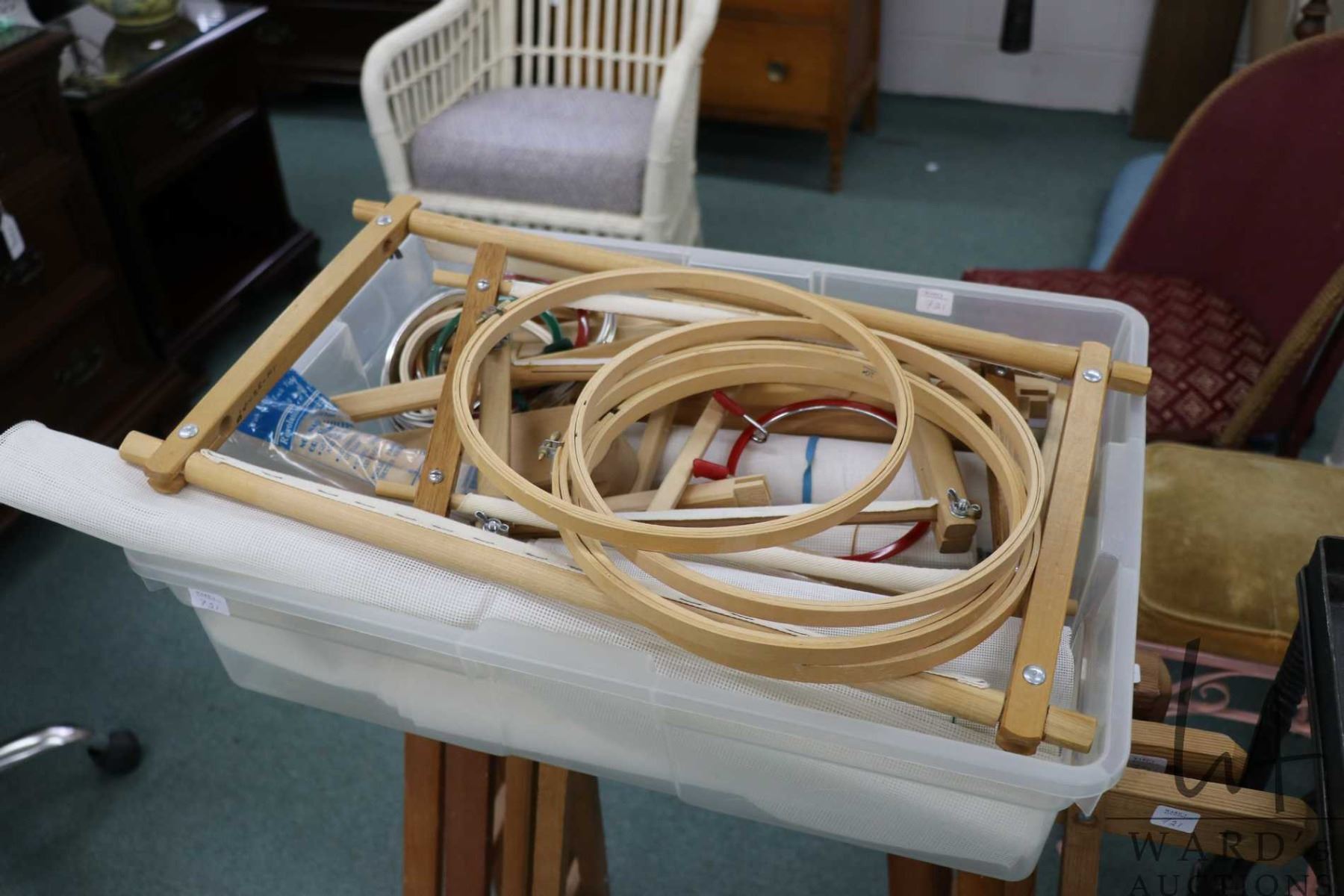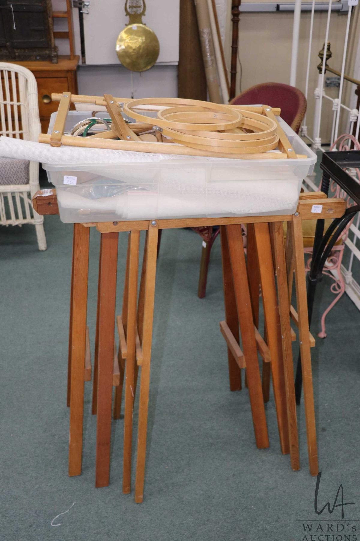 Lot 721 Two wooden trestle sets and a large selection of embroidery hoops, framed and Aida cloth etc.