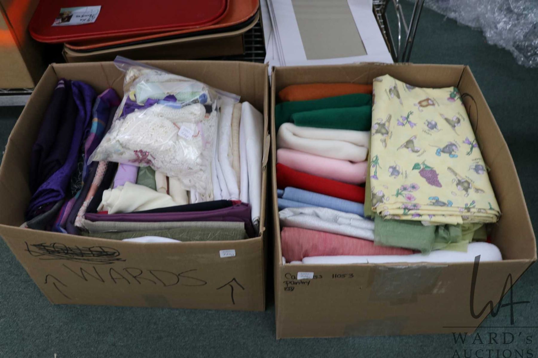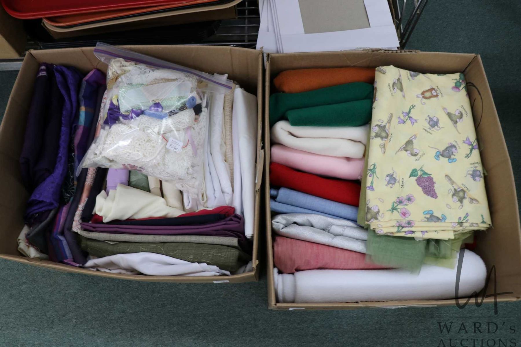 Lot 726 Two boxes of fabric and a bag of lace including cotton, embroidered etc.