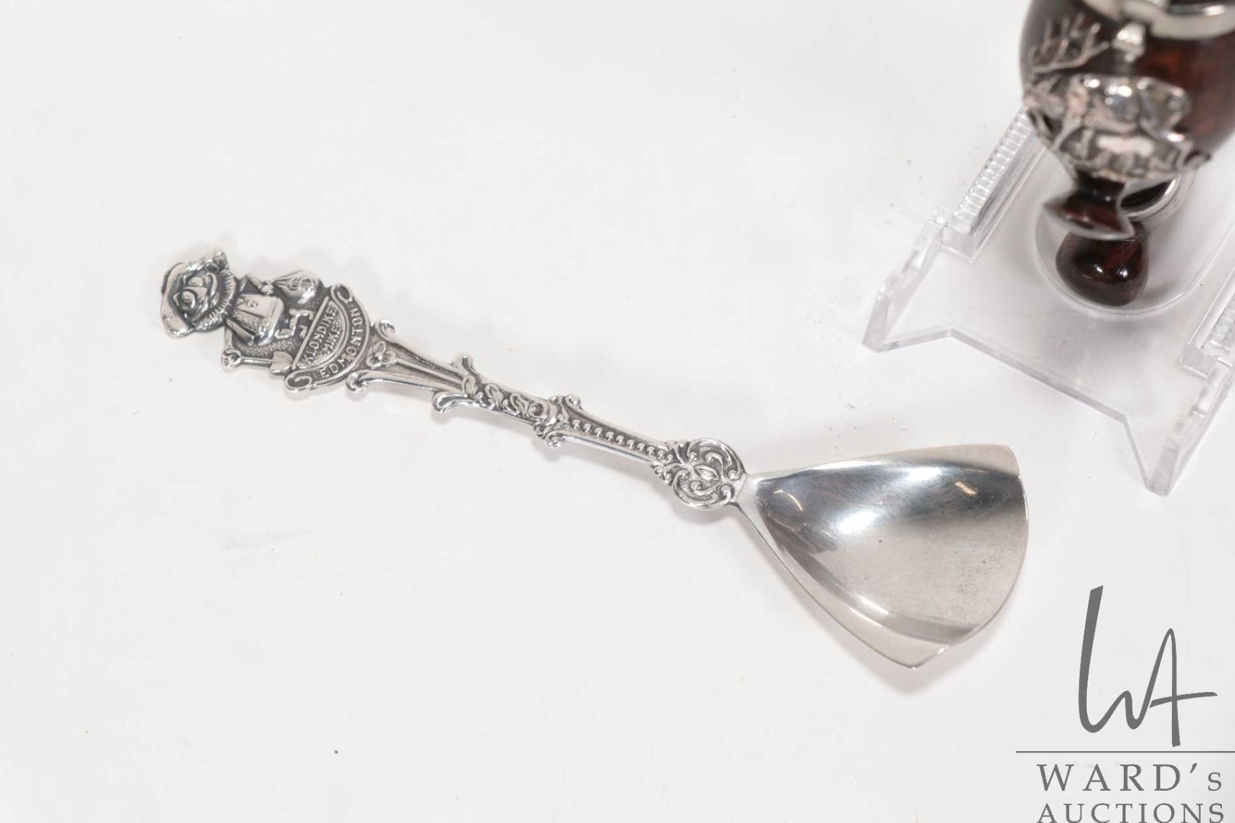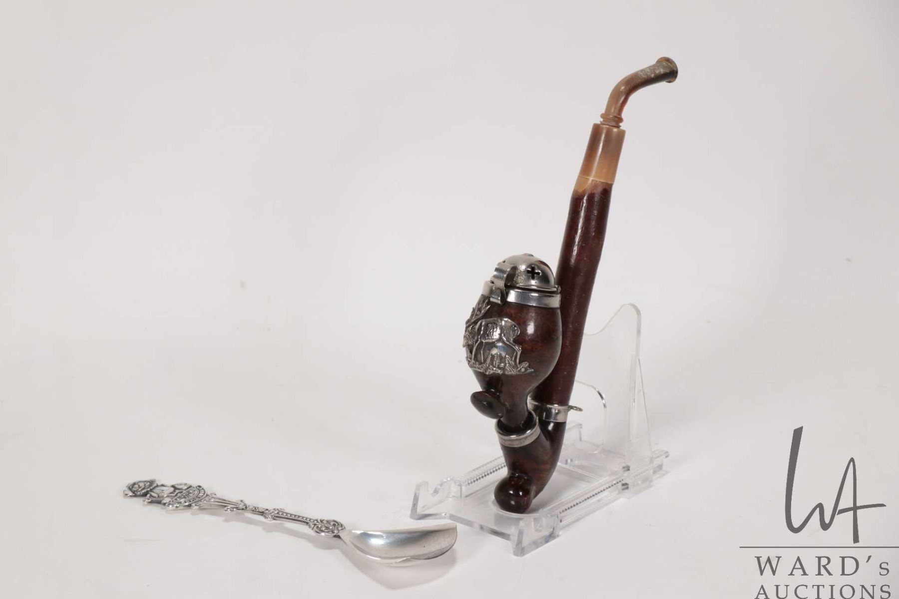 Vintage carved wooden Tyrolean smoking pipe with silver elk emblem and metal wind cover plus a Klondike Mike .90 silver spoon