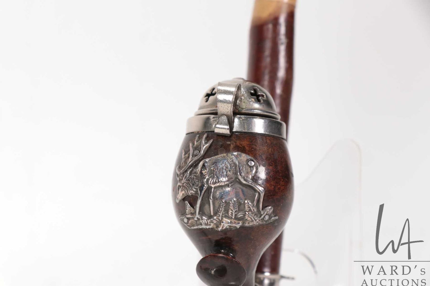 Lot 730 Vintage carved wooden Tyrolean smoking pipe with silver elk emblem and metal wind cover plus a Klond
