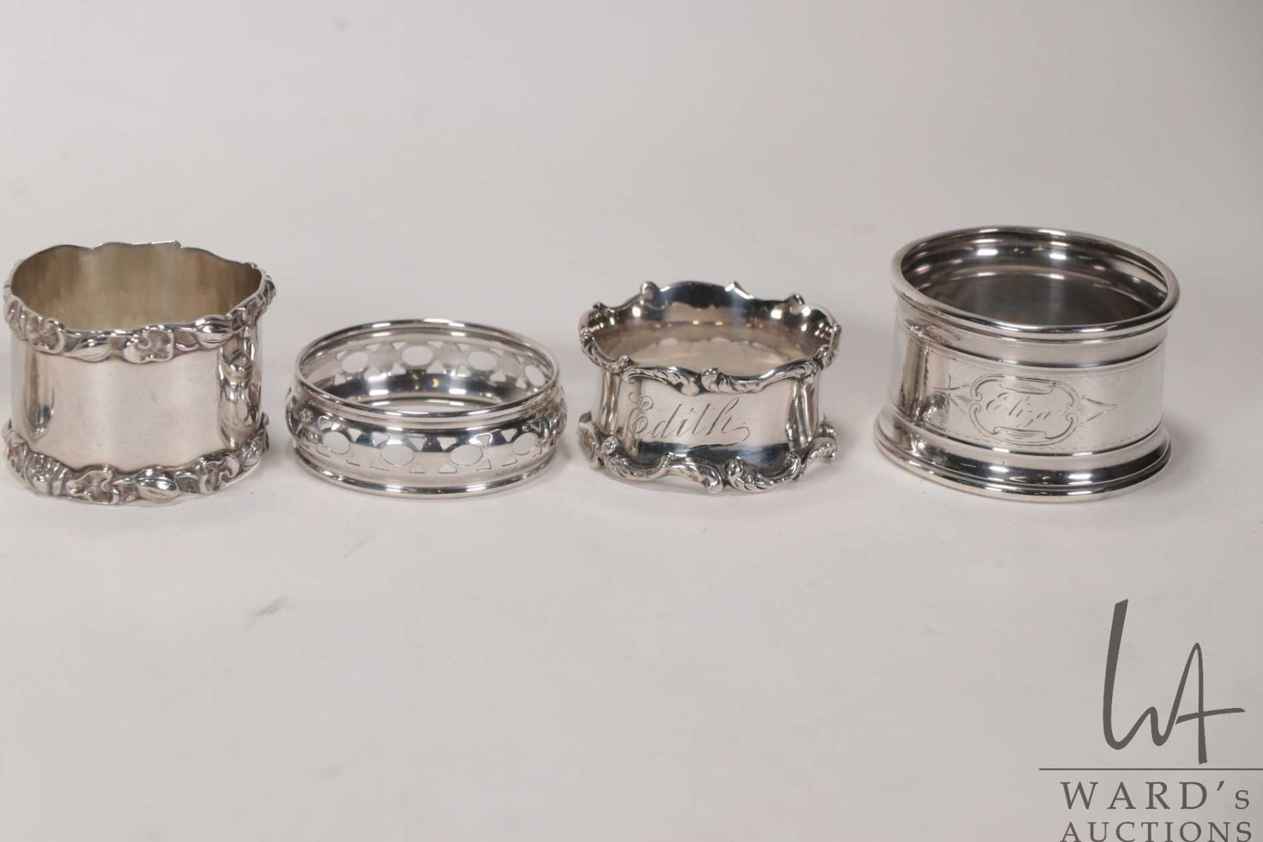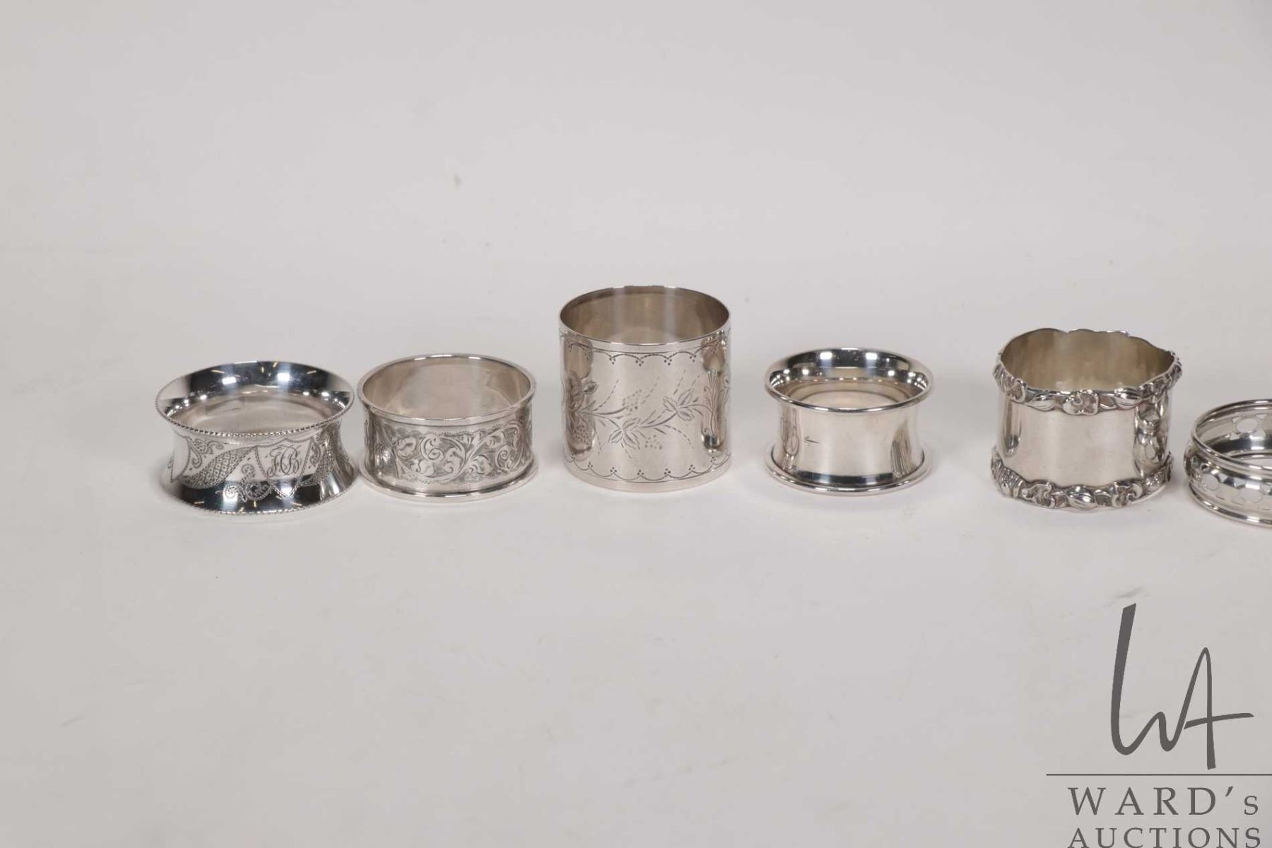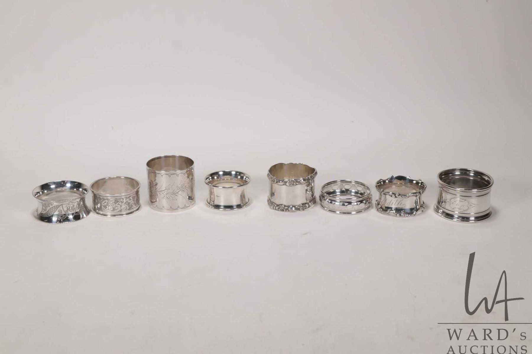 Lot 731 Eight vintage and antique silver napkin rings including five sterling, some with British hallmarks a