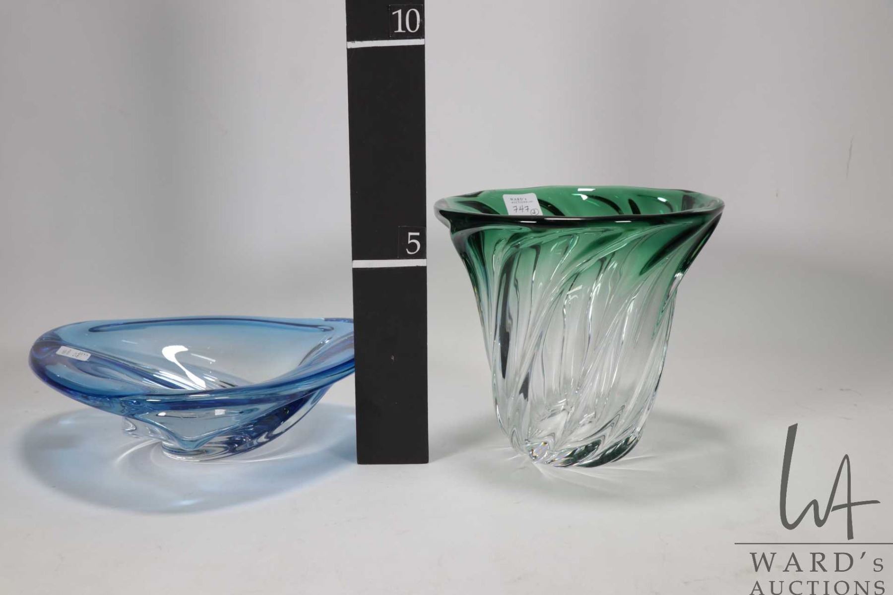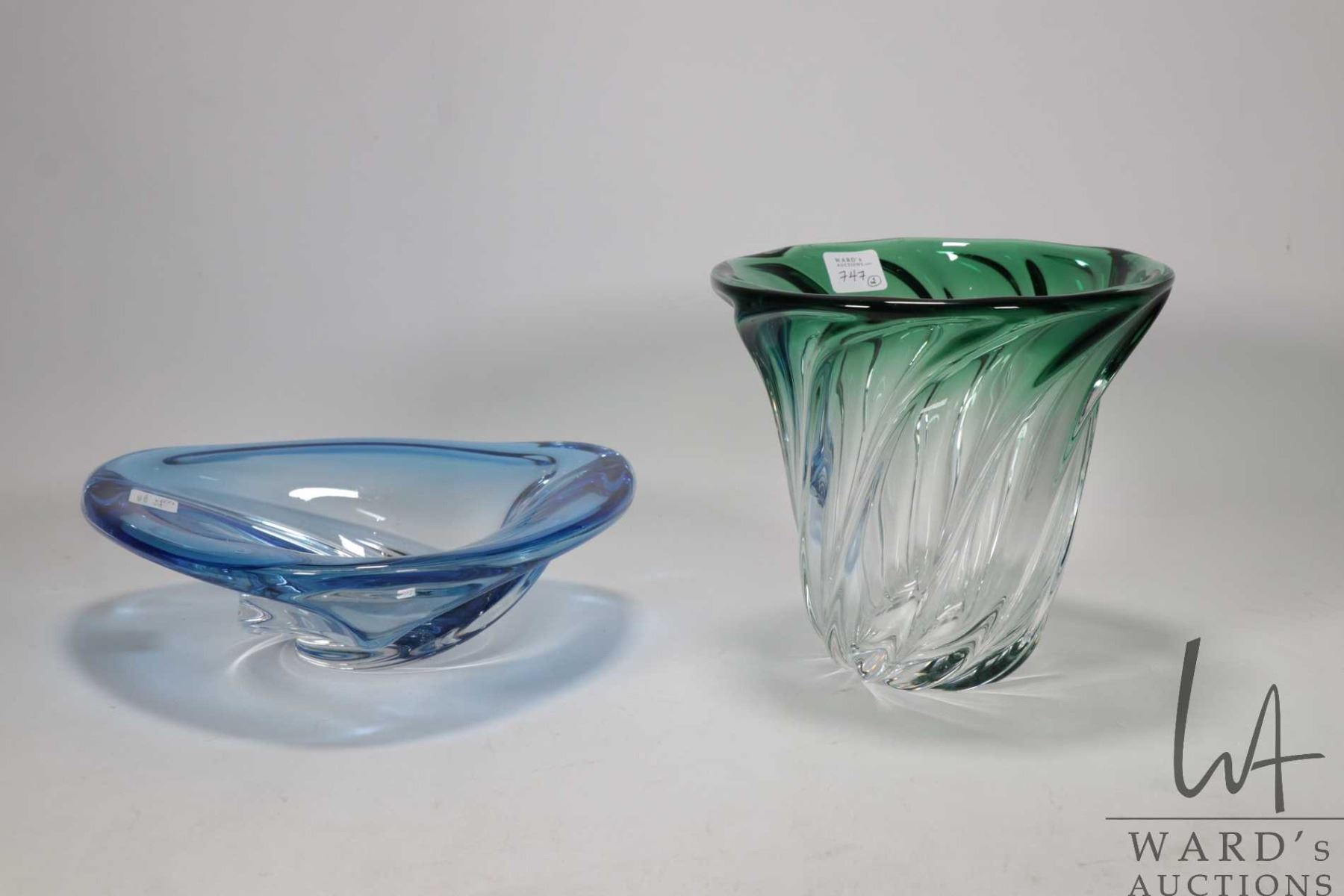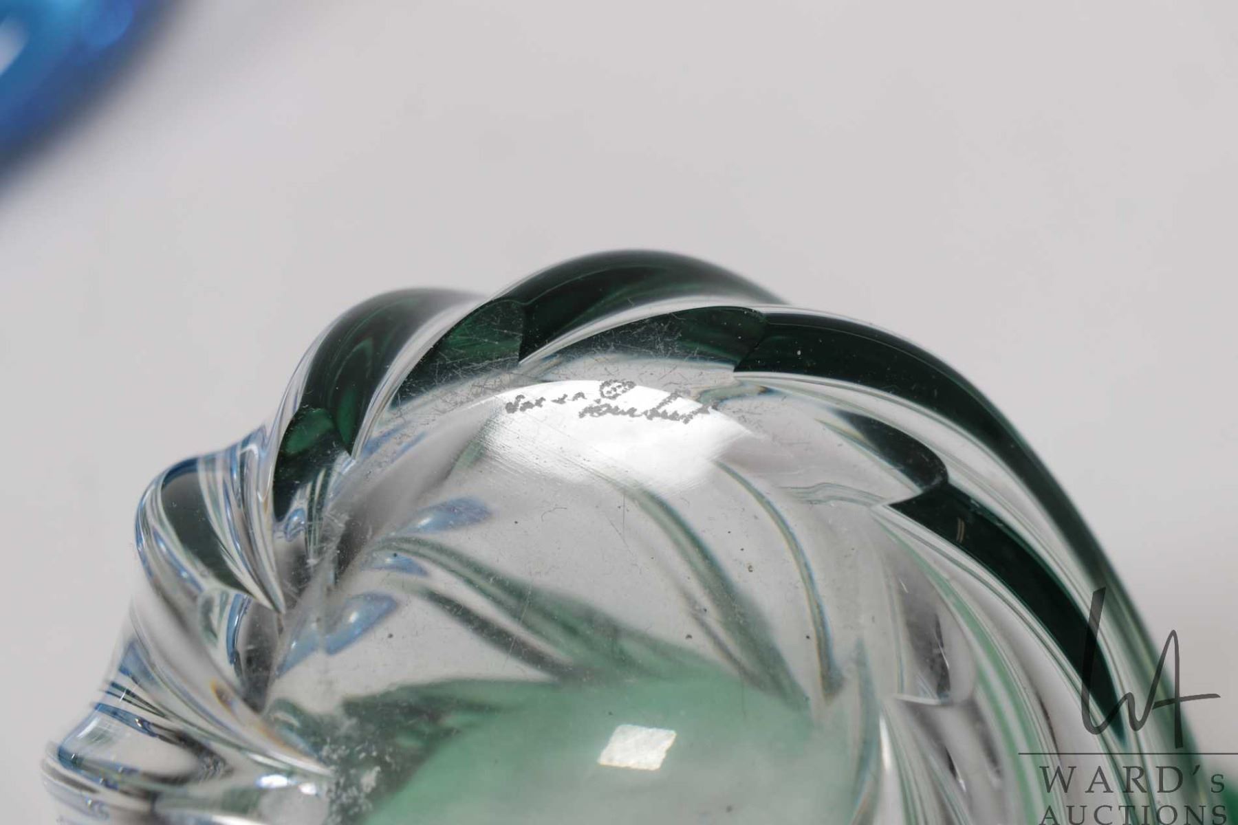 Two vintage signed Val St. Lambert crystal pieces including cobalt blue over clear 9" in diameter and a 6 1/2" green over clear vase, both circa 1950's-60's and possible designed by Rene Delvenne and part of the Patelle Torsade collection