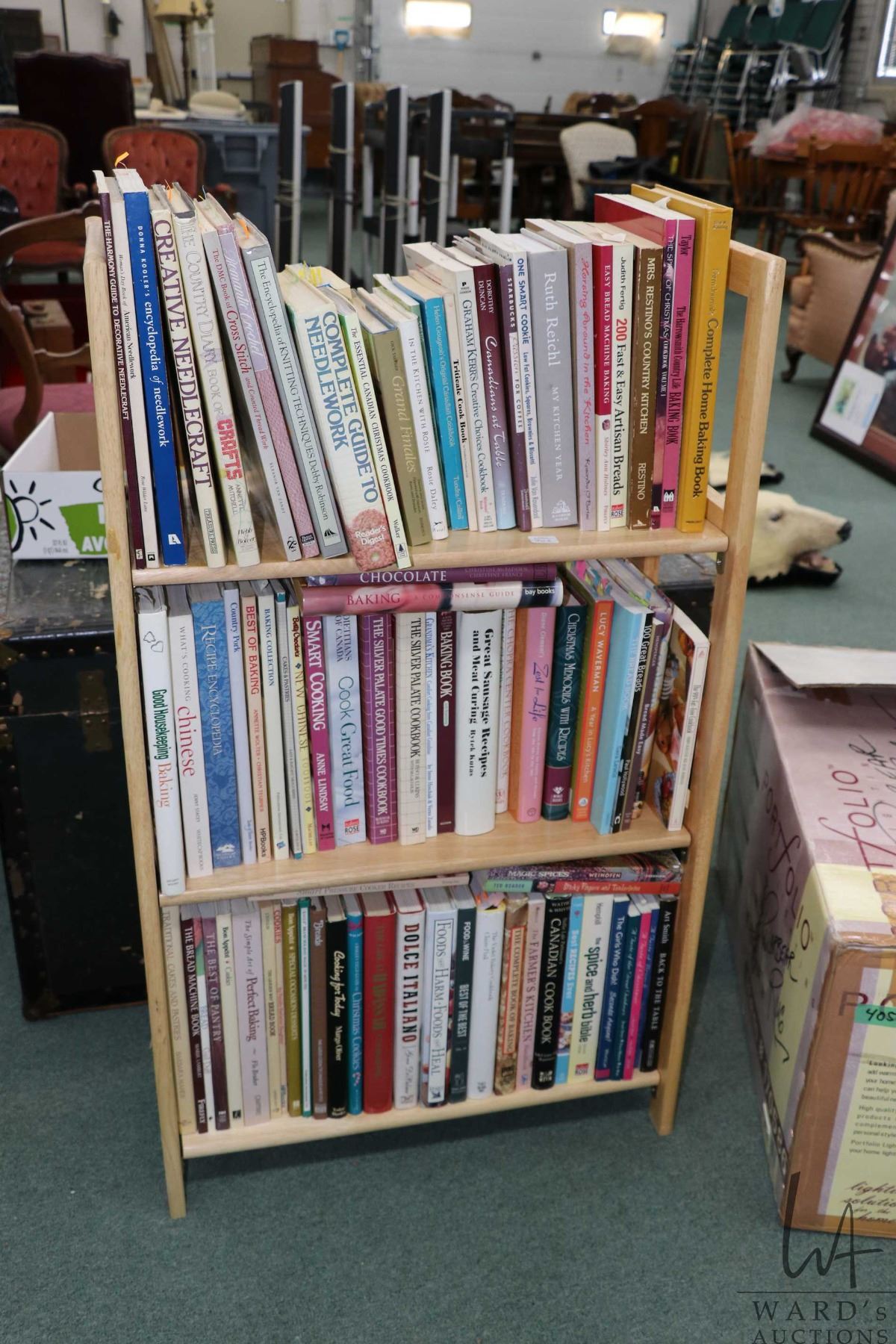 Lot 753 Folding three tier blonde wooden bookcase with a large selection of cookery books and some needlecra