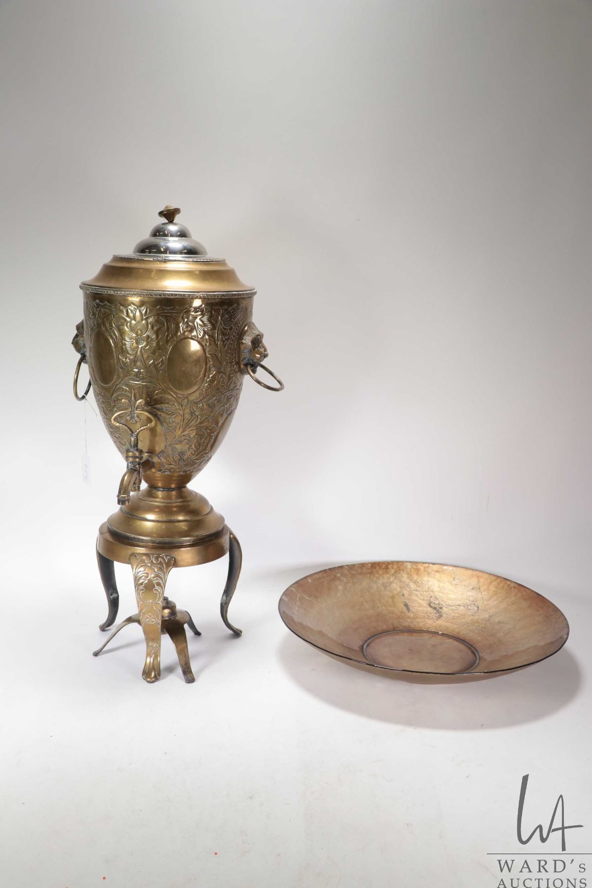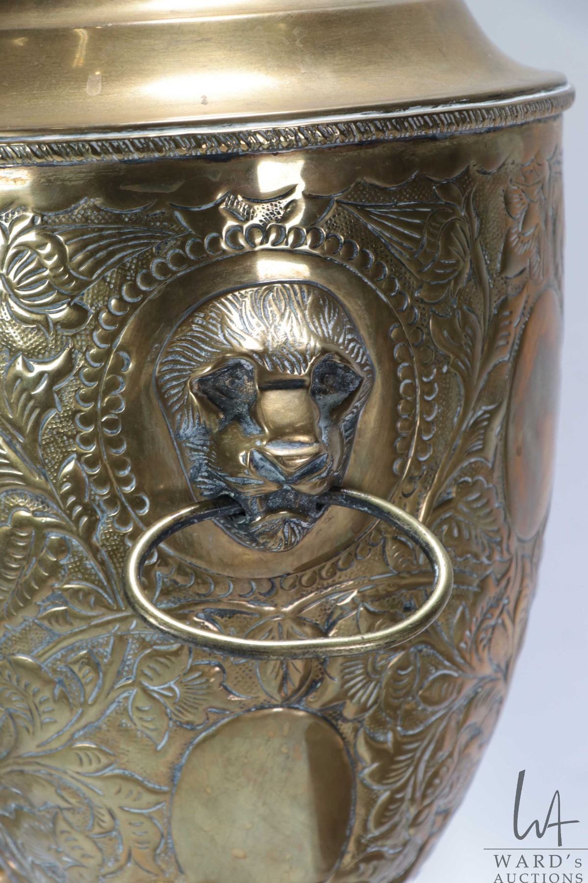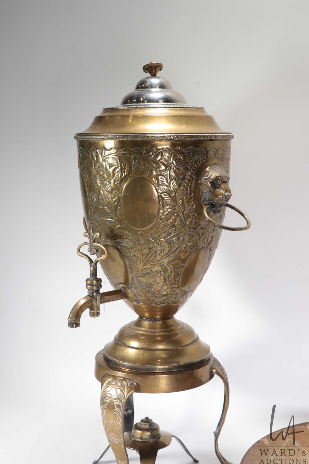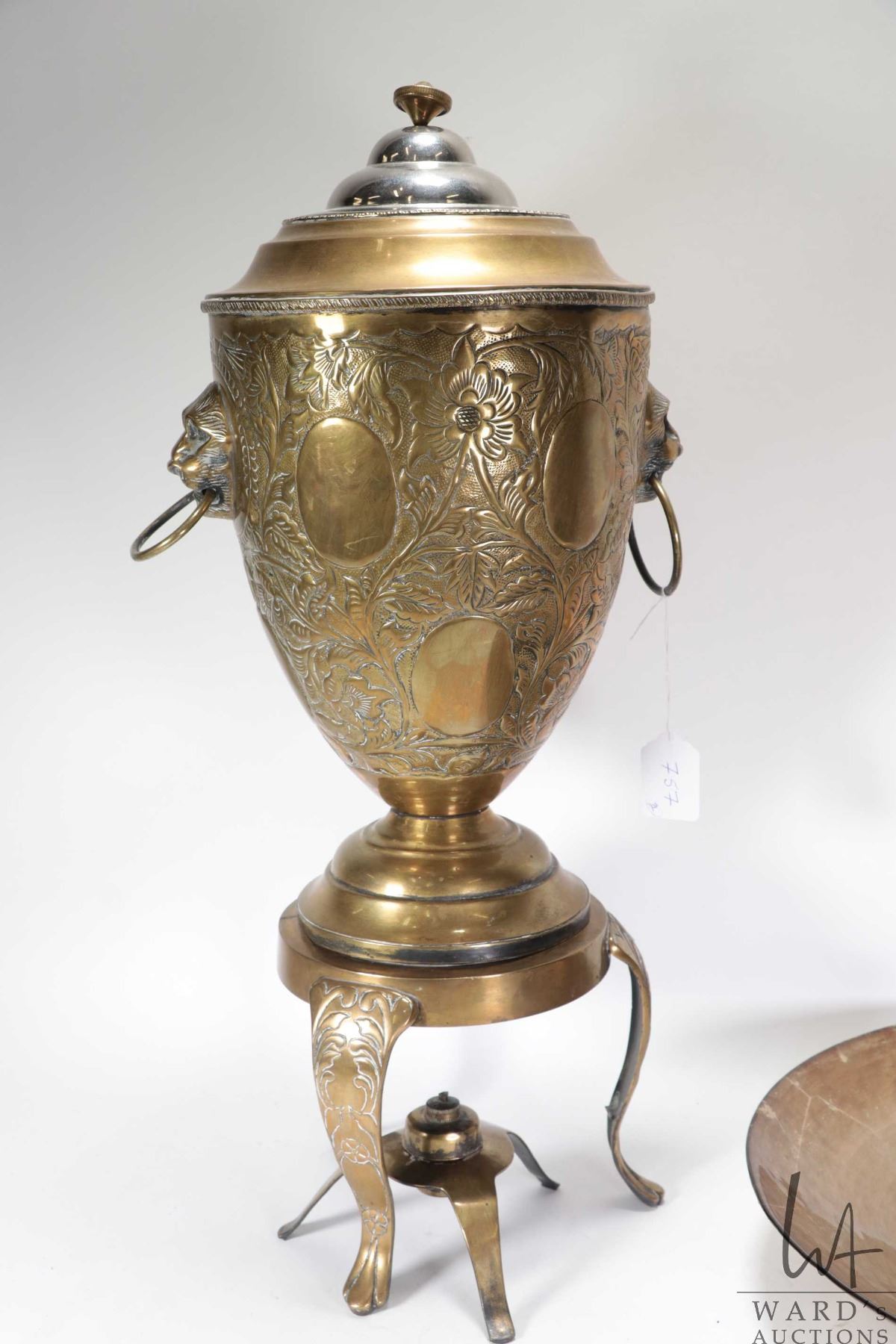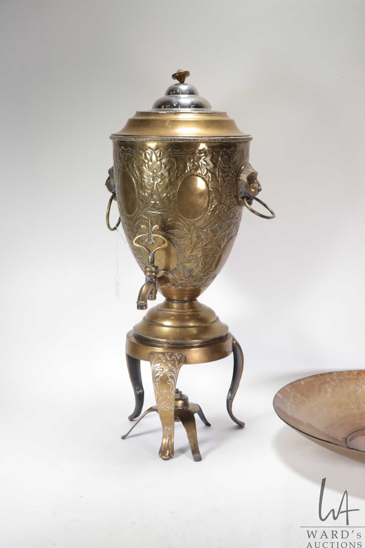 Lot 757 Large vintage brass samovar with repouse decorations and lions head handles, missing original top, 2