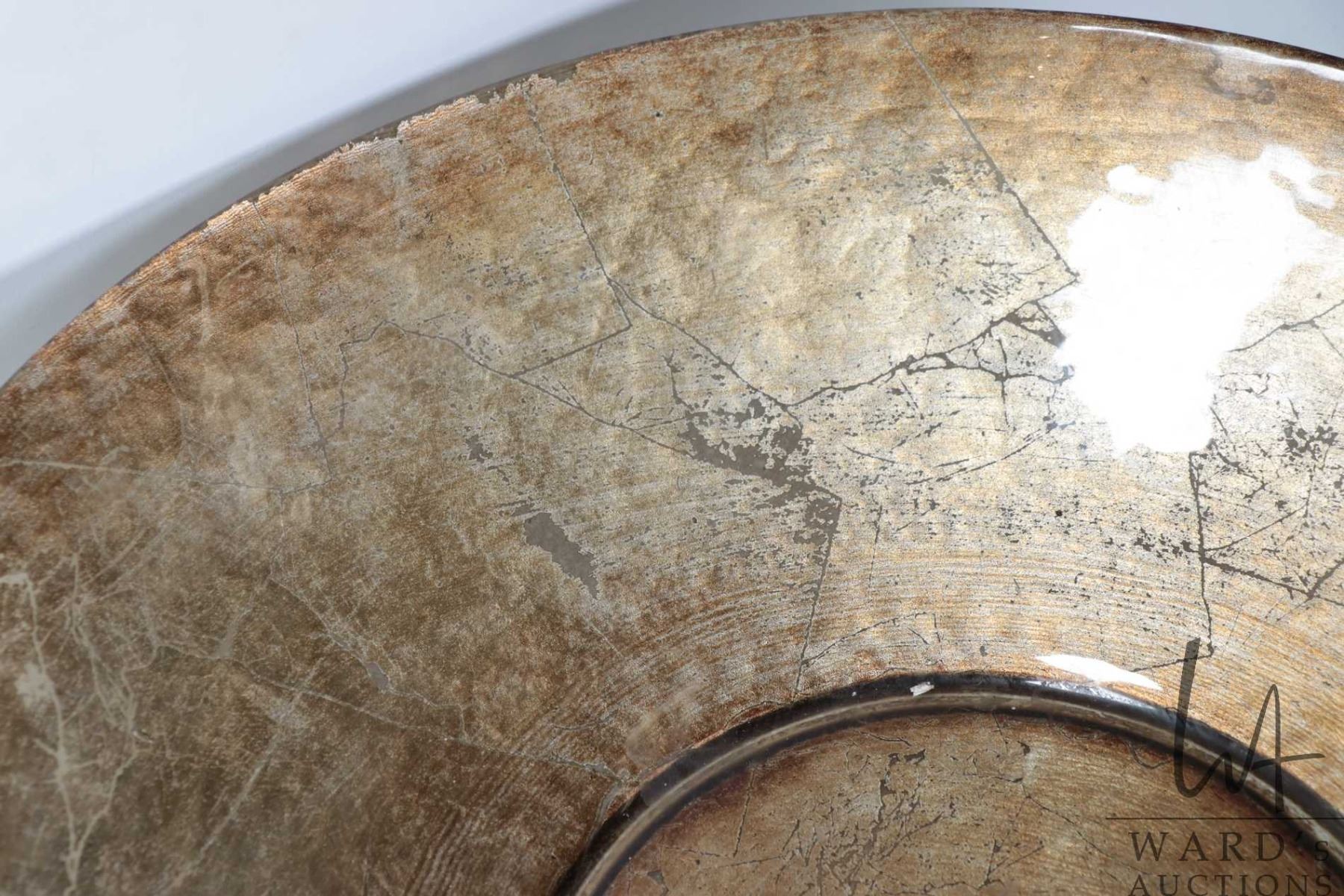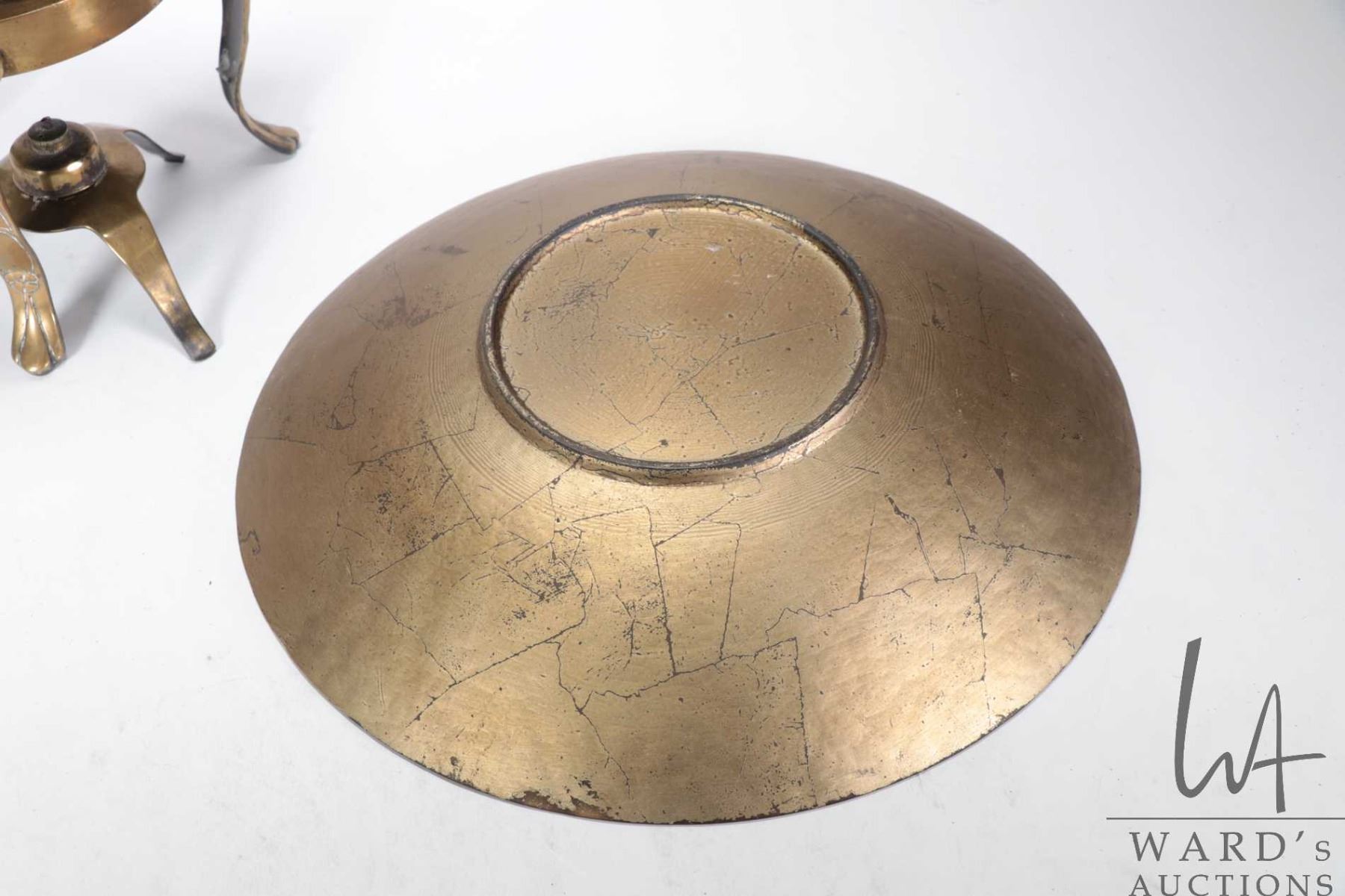 Large vintage brass samovar with repouse decorations and lions head handles, missing original top, 23" in height plus a crackle glazed bowl, 15" in diameter
