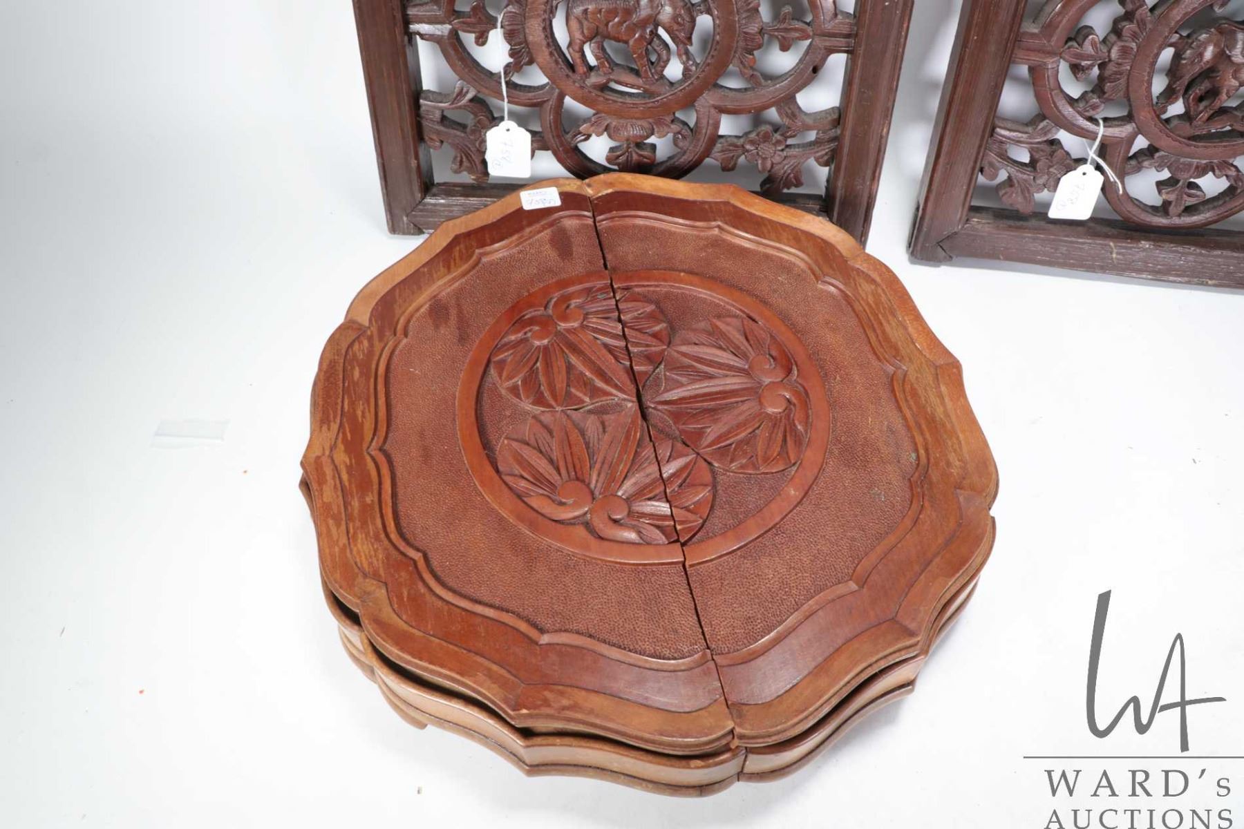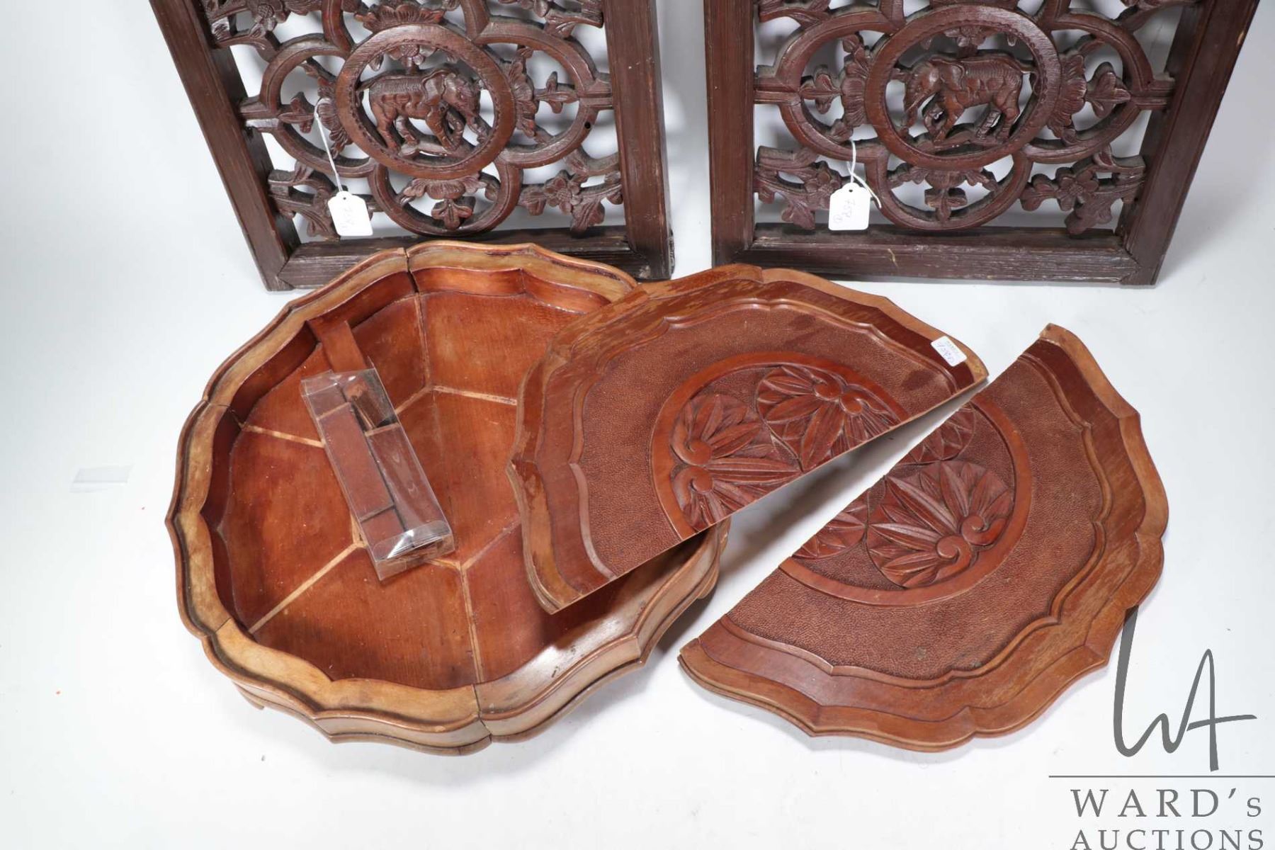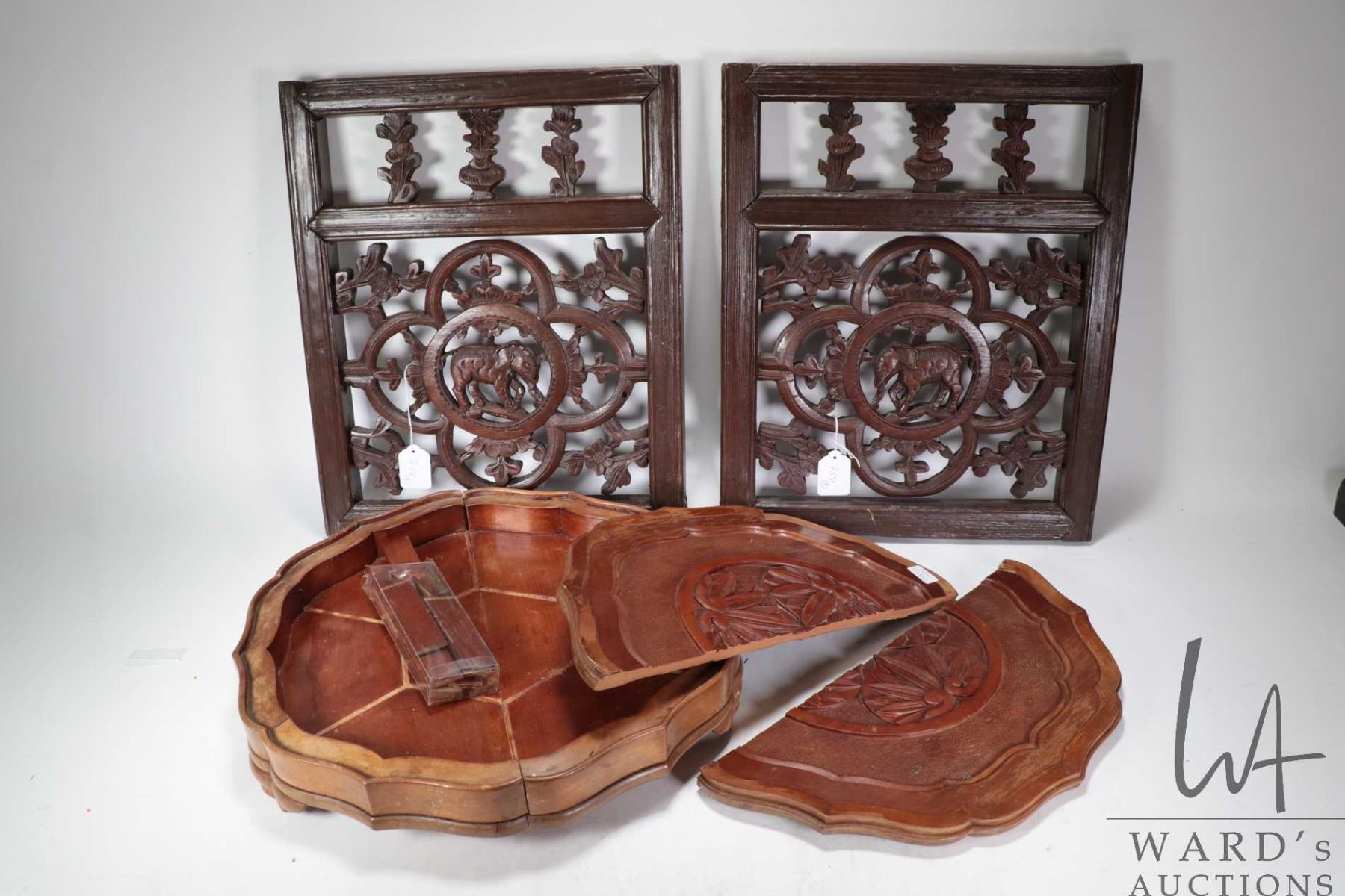 Lot 758 Two Thai openwork carved elephant panels, each 17 3/4" X 15" and a decorative carved divided box wit
