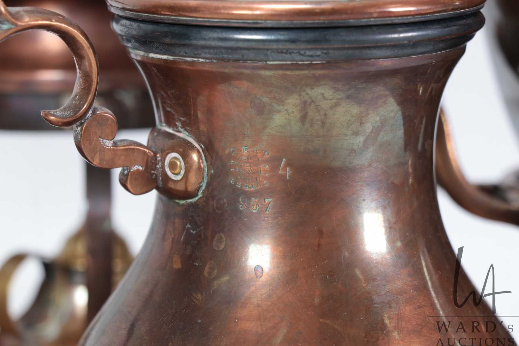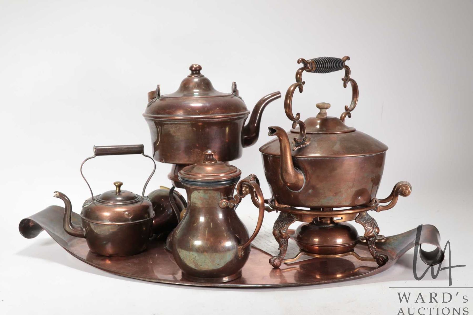 Lot 759 Selection of copper including teaset purportedly belonging to Annie Olivia Tiffany Mitchell ( 1844-1