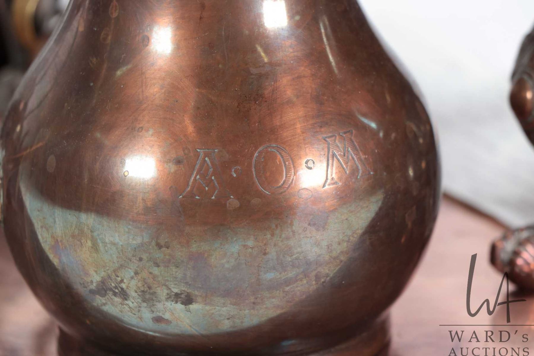 Selection of copper including teaset purportedly belonging to Annie Olivia Tiffany Mitchell ( 1844-1937) daughter of Charles Tiffany ( 1817-1902) founder of Tiffany & Co. New York . The tray is monogrammed "AOM" as are some of the pieces. Appears to have once been silverplate on copper.