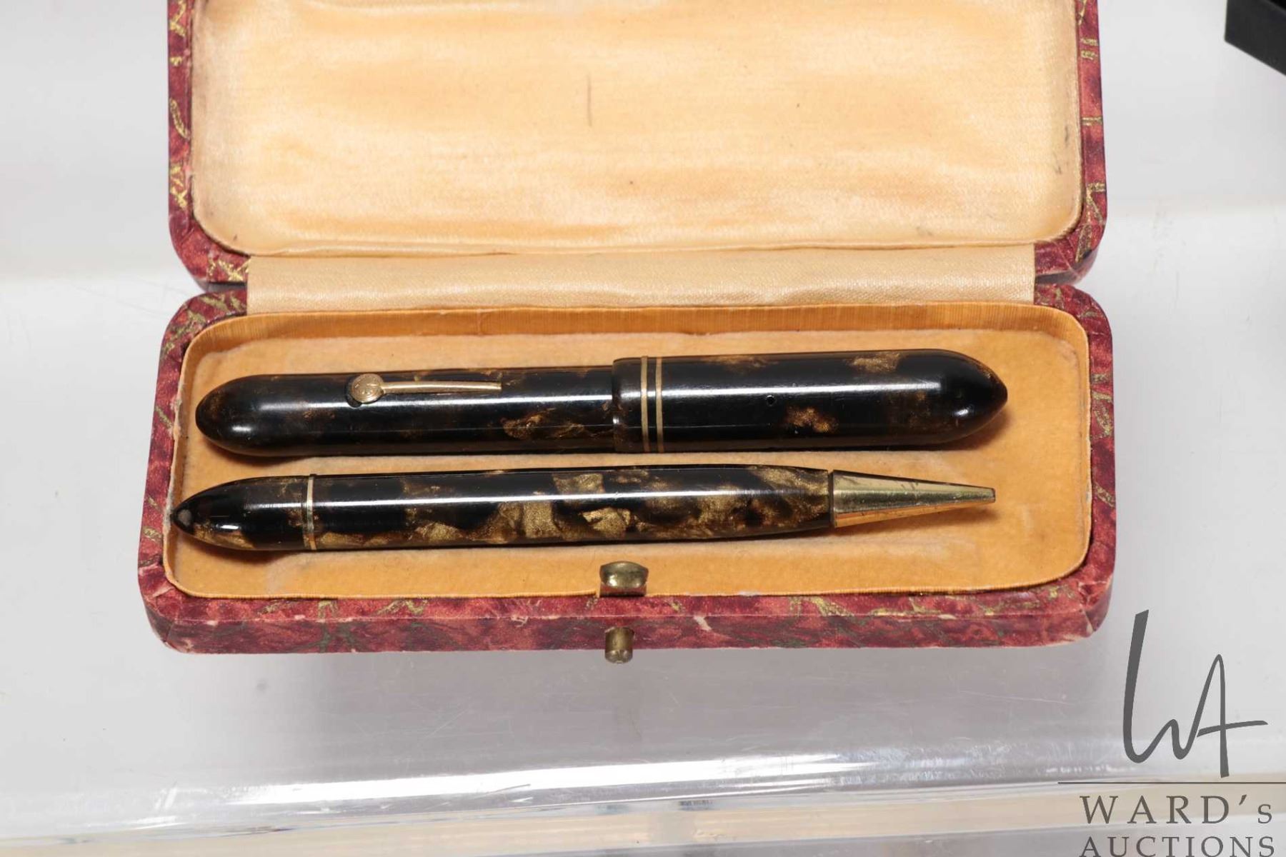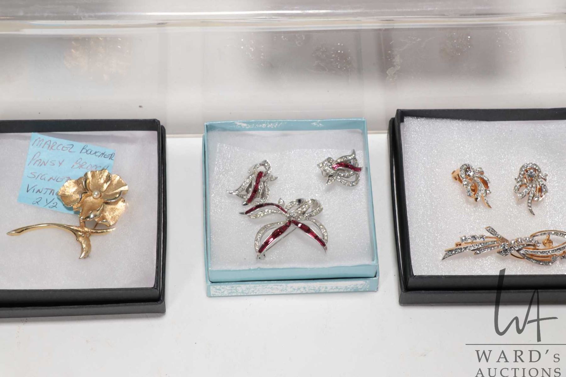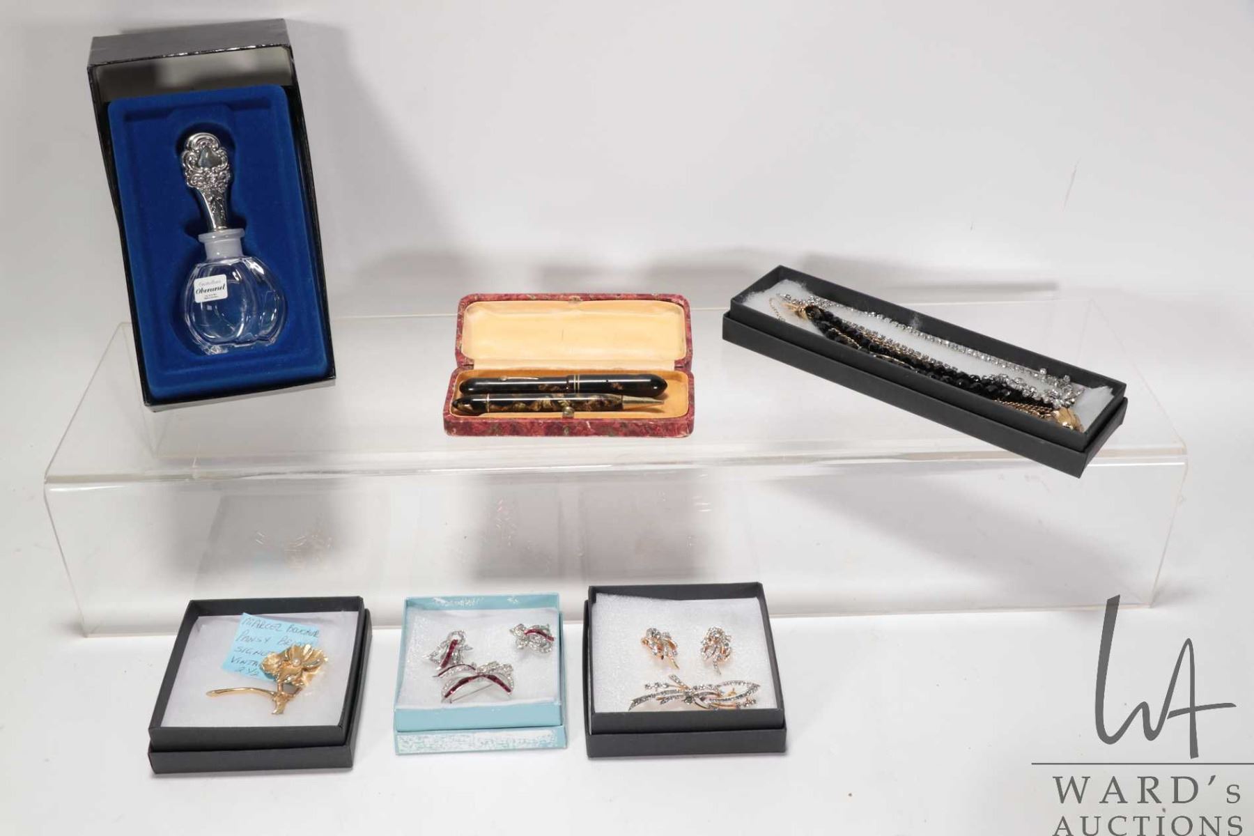 Tray lot of vintage and collectible jewellery including signed Sherman necklace set with round and marquise cut crystal gemstones, Boucher gold tone and jet style beaded bracelet, Boucher red crystal brooch with matching earrings, Boucher gold tone pansy brooch, an unmarked gold tone brooch set with clear stones, a fountain pen and mechanical pencil set plus a Beauty Mark perfume with sterling silver top