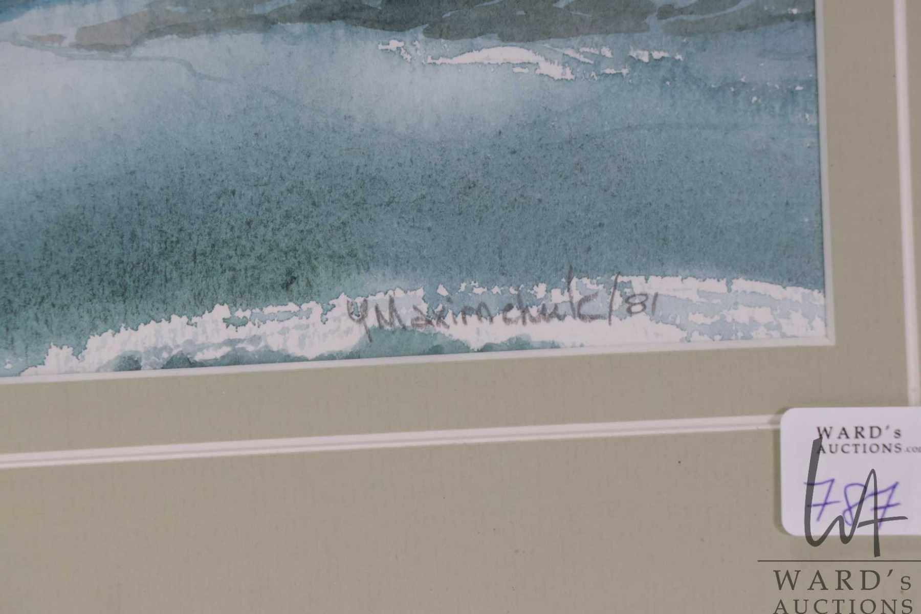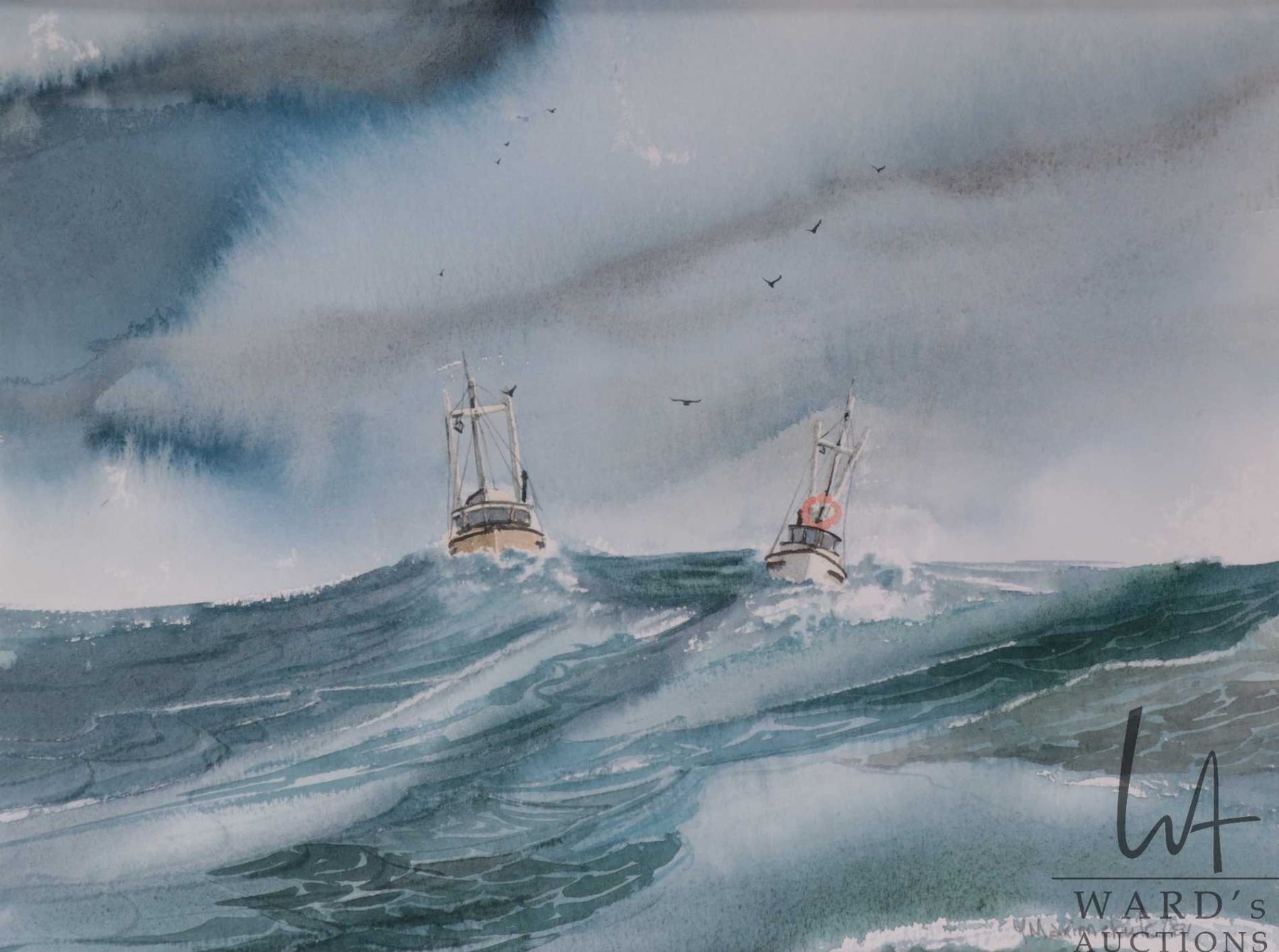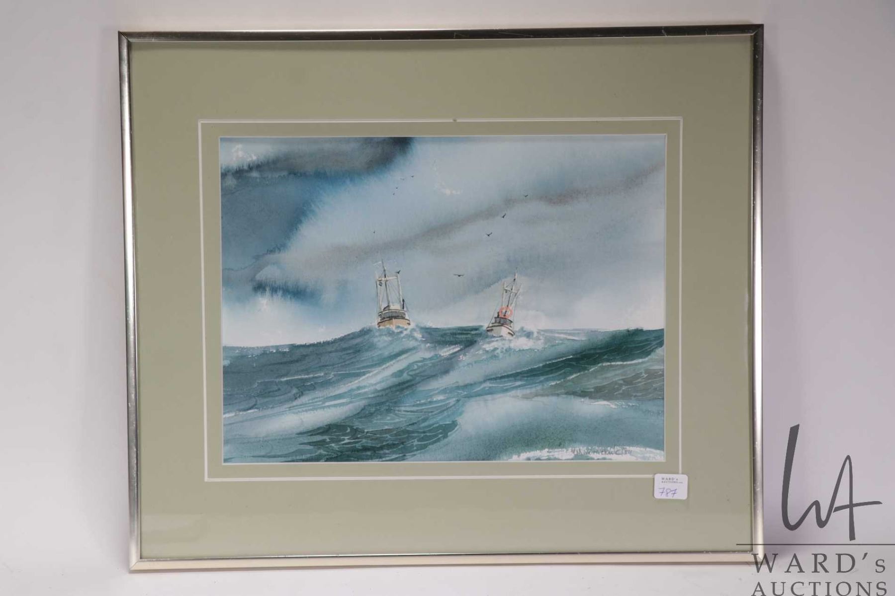 Lot 787 Yvonne Maximchuk, framed original watercolour painting of fishing boats on a rough sea, 10" X 13 1/2