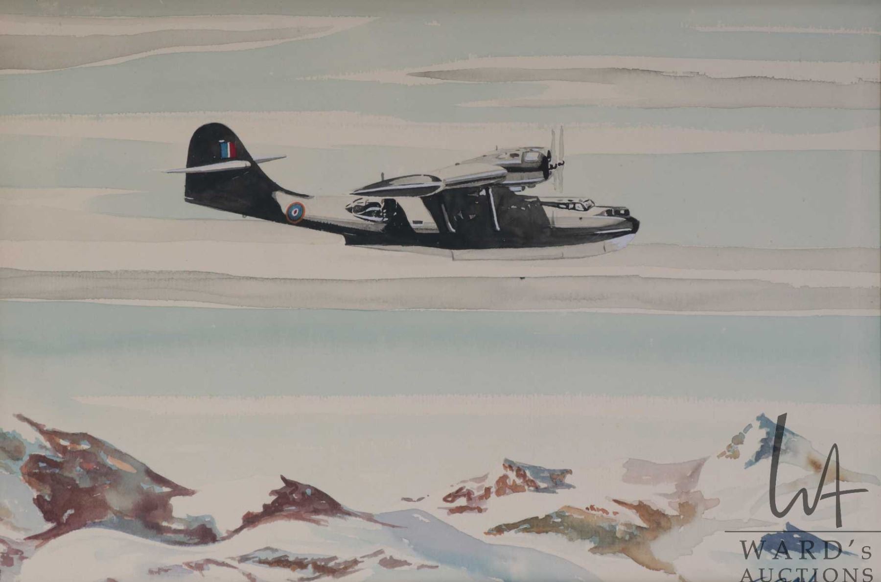 Tracy, framed original watercolour painting of a French plane flying over a mountain range, 7 3/4" X 12"