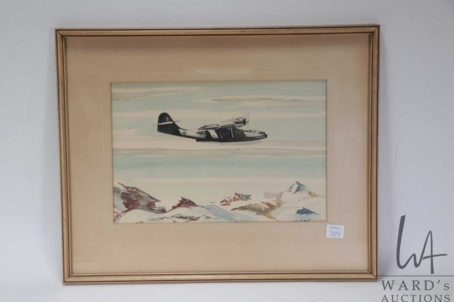 Lot 789 Tracy, framed original watercolour painting of a French plane flying over a mountain range, 7 3/4" X