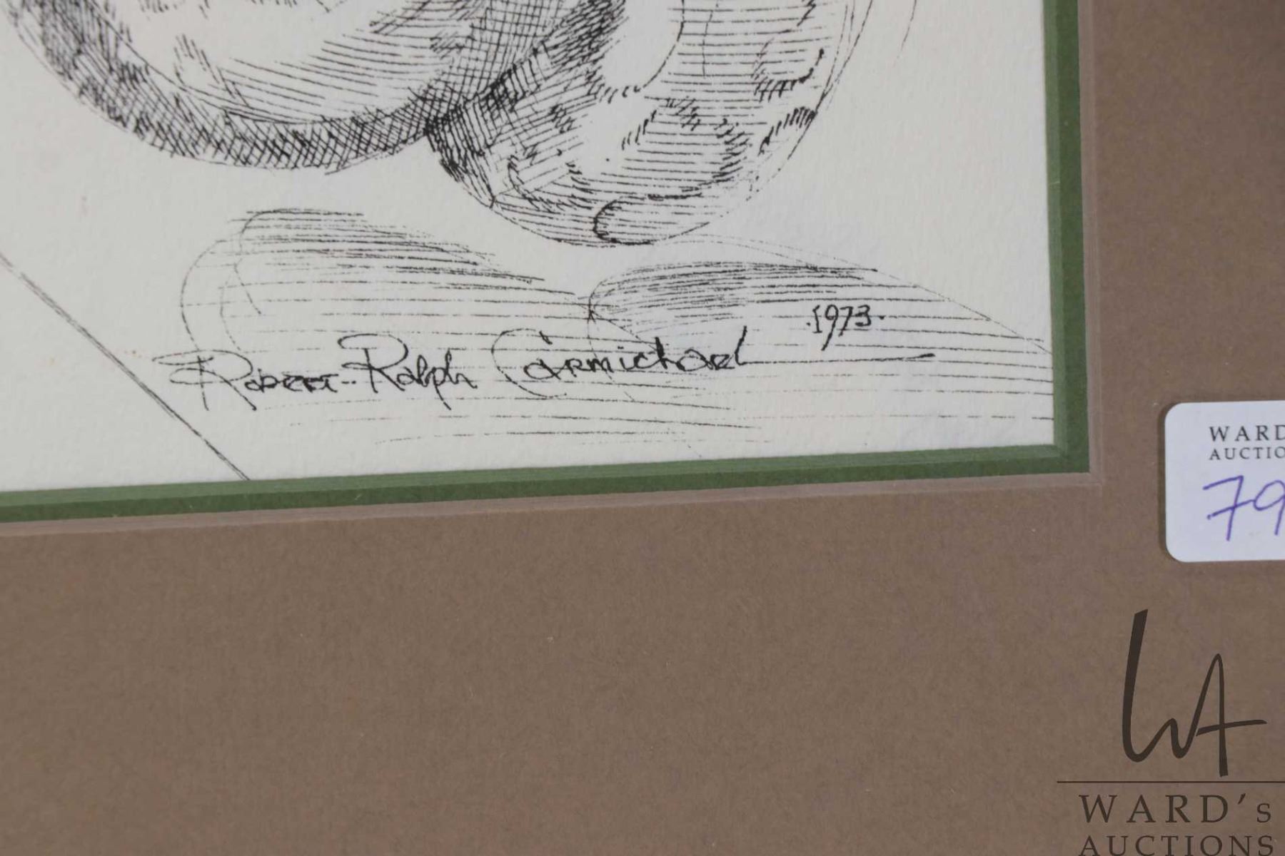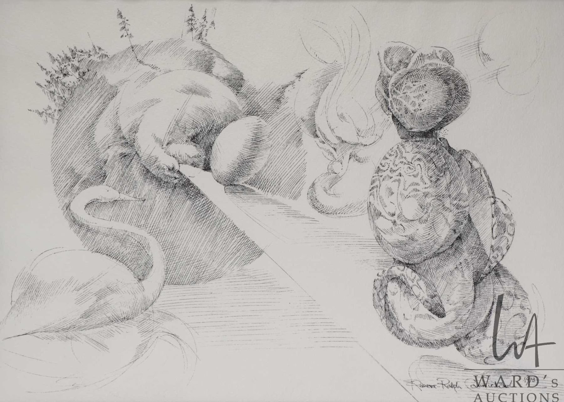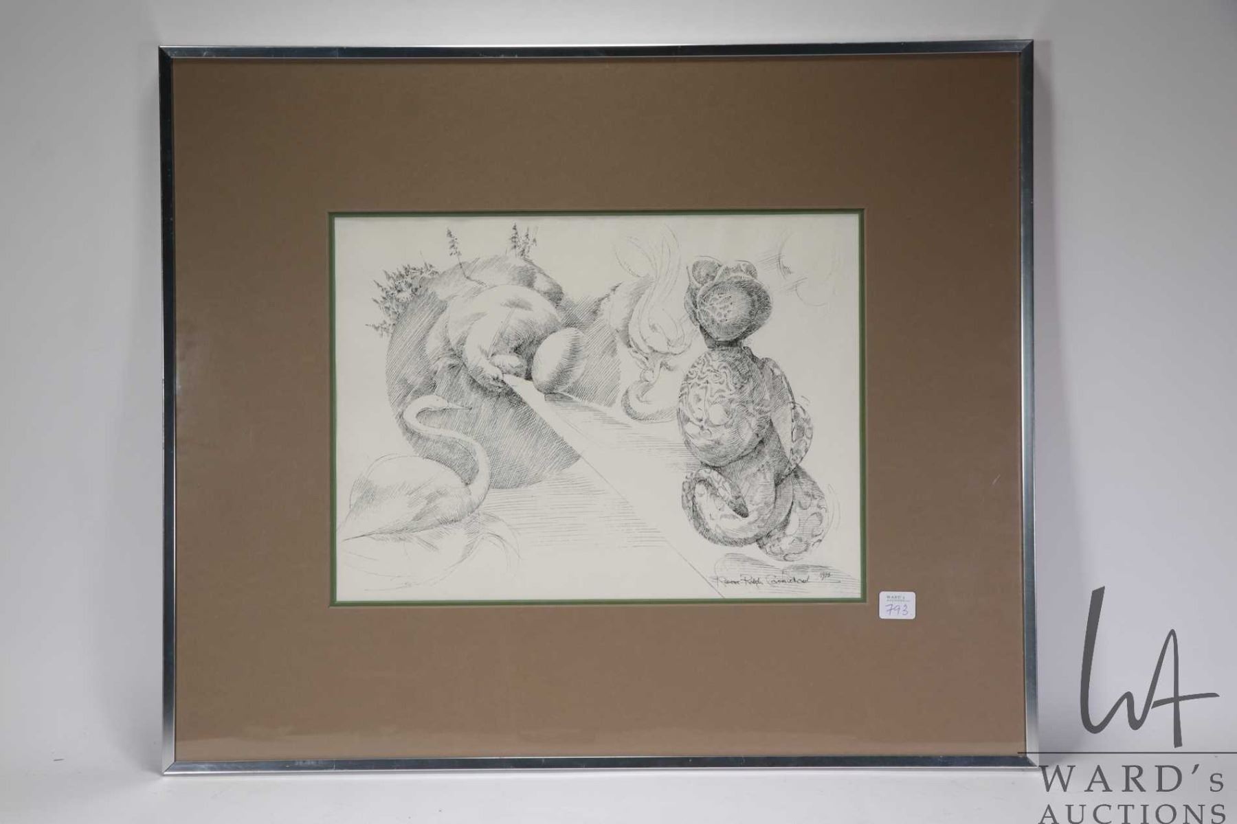 Lot 793 Robert Ralph Carmichael, framed ink on paper drawing snake and goose, 10 3/4" 14 1/2"
