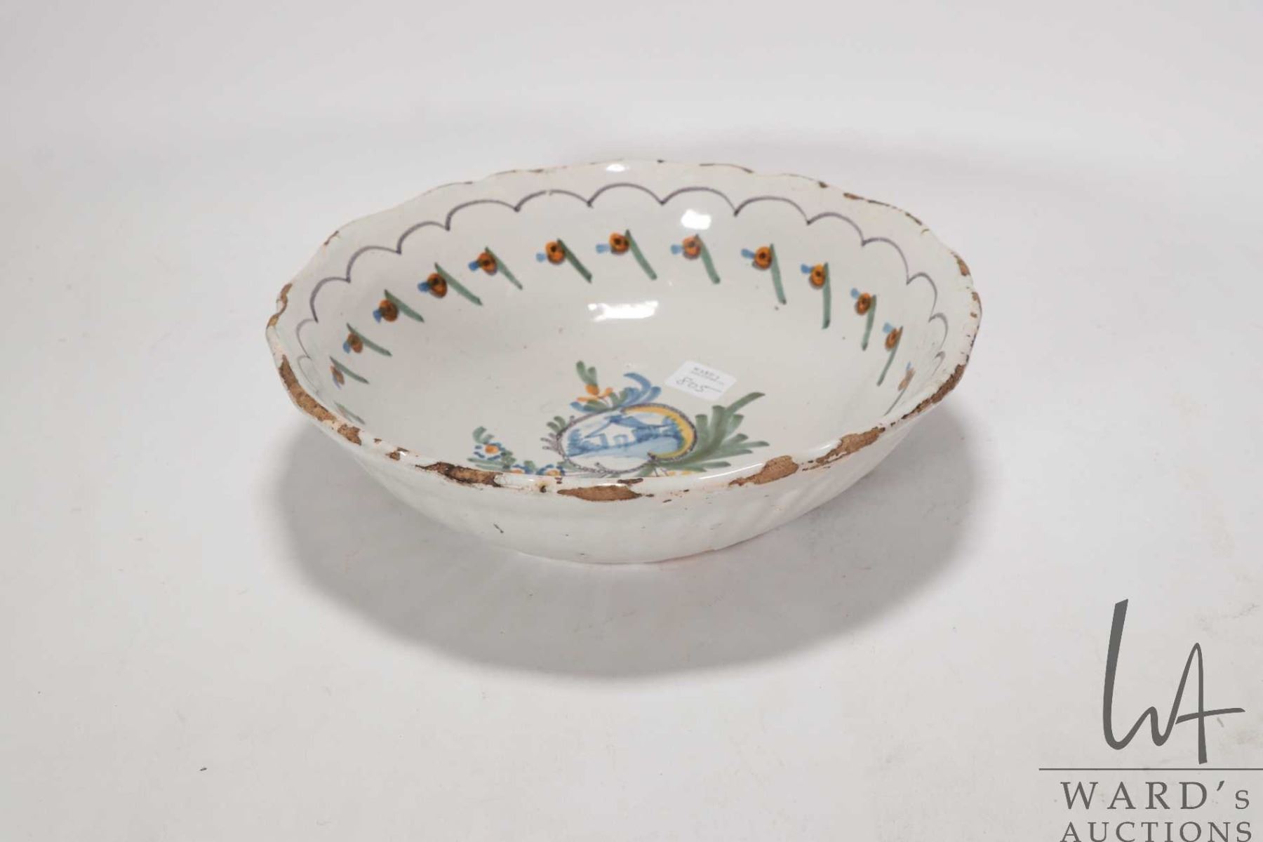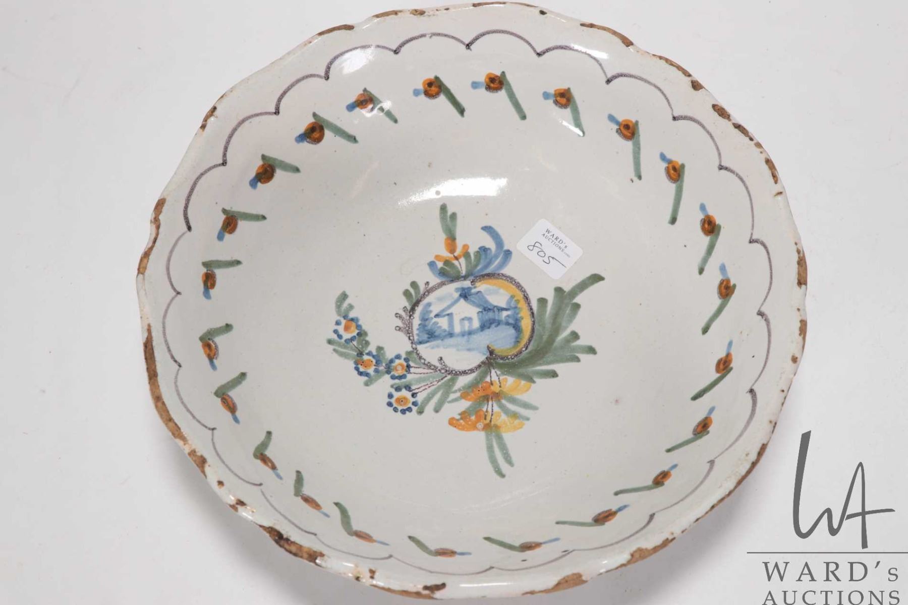 Lot 805 Antique 17th - 18 century hand painted possibly French faience, tin glazed bowl, 10" in diameter