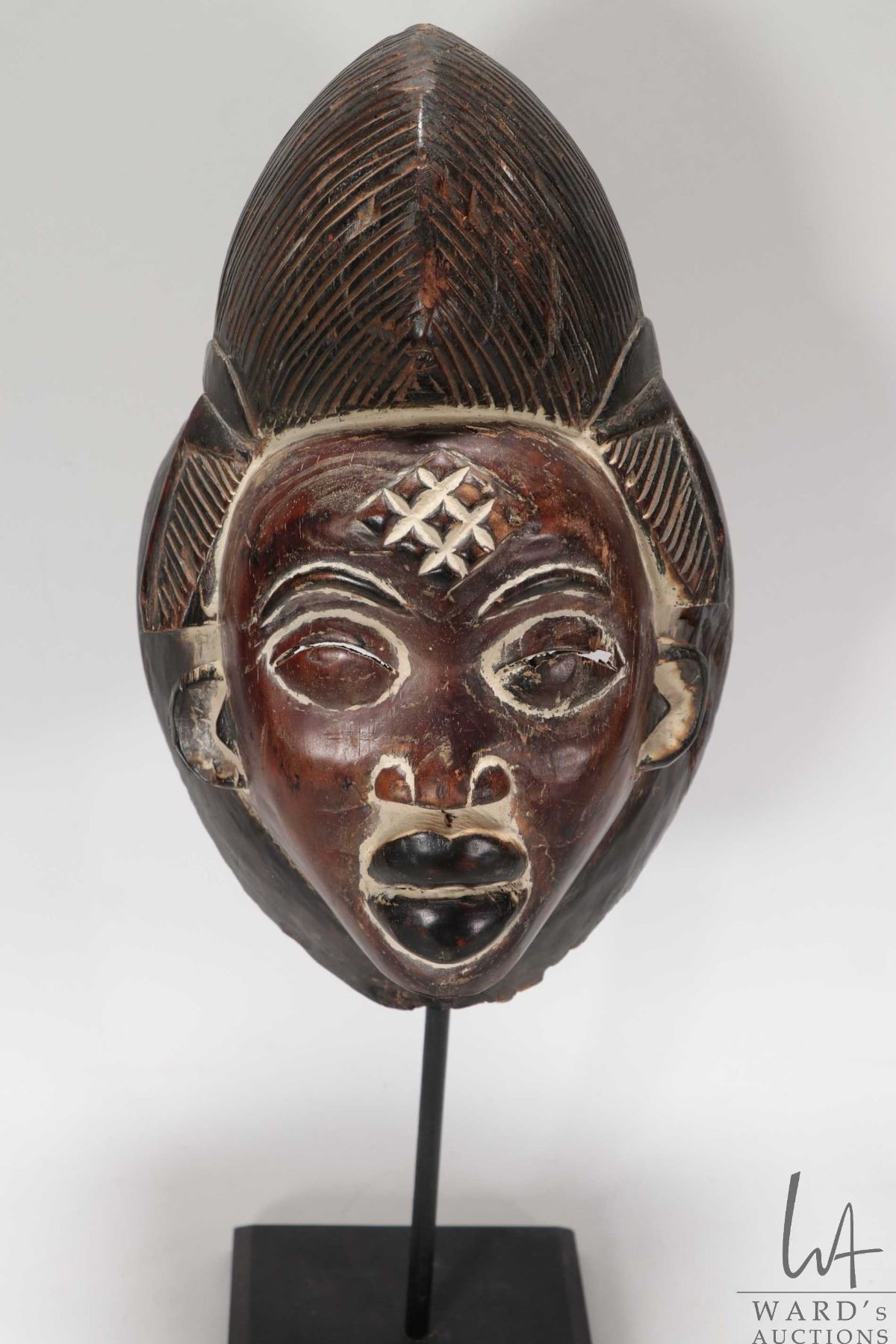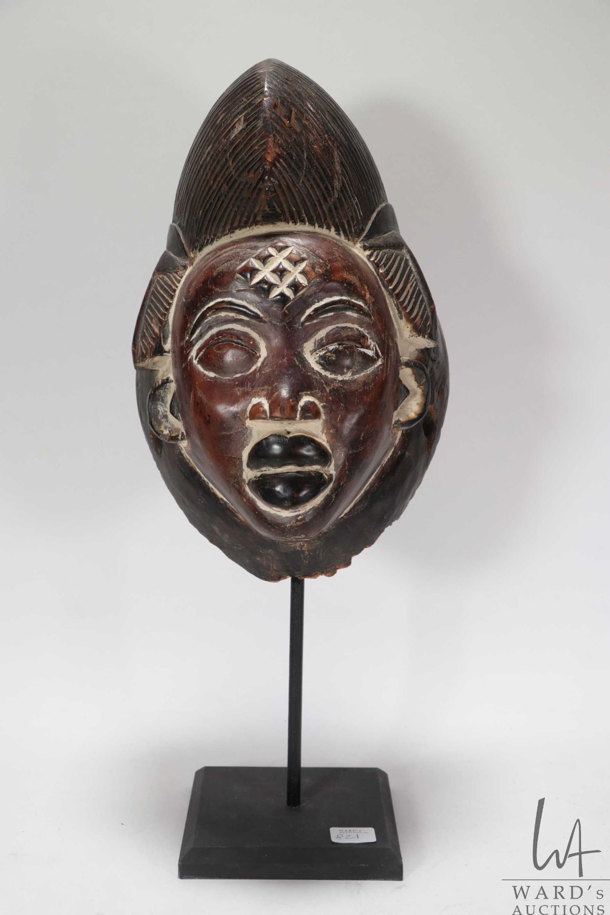 Hand carved Punu mask, purportedly originating from the Punu people of Gabon South Africa, 18 1/2" including stand