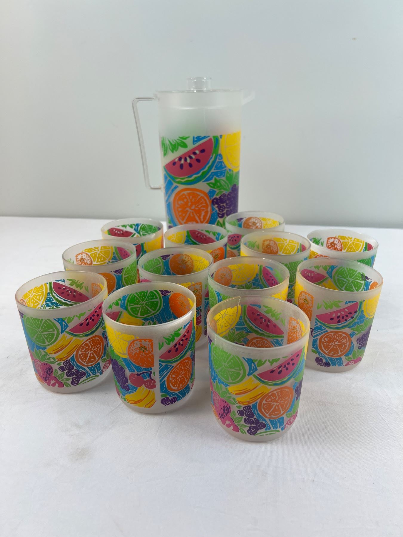 Plastic - includes pitcher and 12 cups - have some wear and fading of color