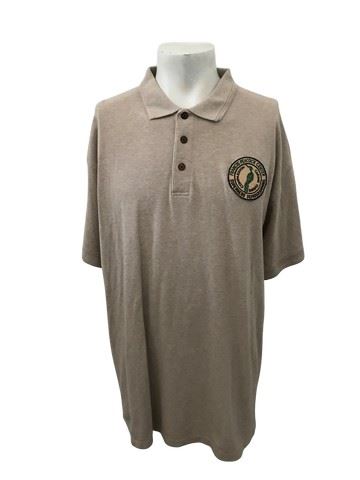 The Tick TV show (2016) - Background character short sleeve khaki colored polo shirt with Frances Peacock Center Superhero Deprogramming patch. Size 2X. This khaki-colored, short-sleeve polo was worn by a background character within the wonderfully strange world of the Amazon Prime series. What makes this piece truly special is the distinctive "Frances Peacock Center Superhero Deprogramming" patch boldly emblazoned on it.