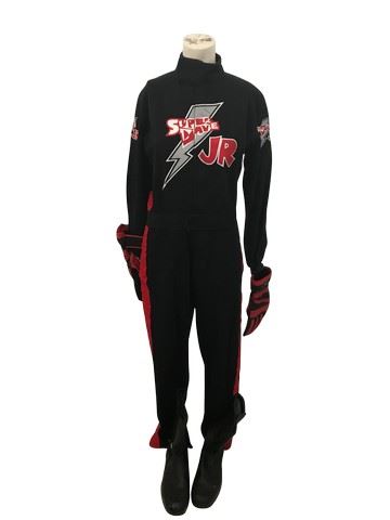 Extreme Adventures of Super Dave - Super Dave Junior (Michael Angarano) black jumpsuit racing jumpsuit with red and black motorcycle gloves and black motorcycle boots.