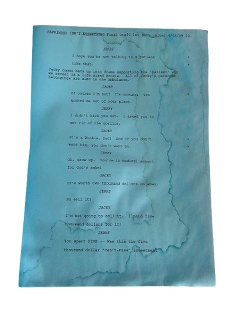 Happiness Isn't Everything -TV movie - "The Kiss" episode - written by Mitchell Hurwitz and Jim Valley, directed by James Burrows. Script is distressed and water damaged, but it is the final draft first revision from April 14, 2009, from Sony pictures TV. The cast featured: Jason Biggs, Richard Dreyfuss, Perry King, and Mary Steenburgen among others. In this episode, the storyline involves Jason's (Jason Biggs) show where a character named Gower (Luke Perry) has a girlfriend who is an alien and controls him with a "meld-kiss". Later in the episode, Jerry (Richard Dreyfuss) gives Jason a kiss on the lips in front of Moon (Michelle Krusiec).
