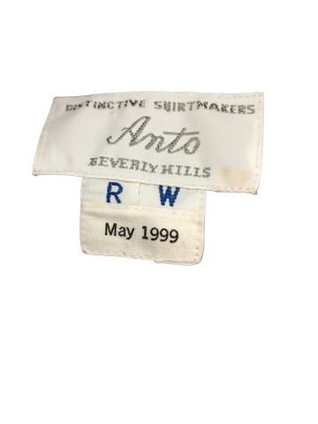 Bicentennial Man (1999) - Andrew Martin (Robin Williams) custom-made Anto of Beverly Hills brown collared dress shirt made with velcro instead of buttons. Includes his initials and May 1999 sewn into the inside tag. Most of his clothes in this film were velcro'd to fit around the robotic body.
