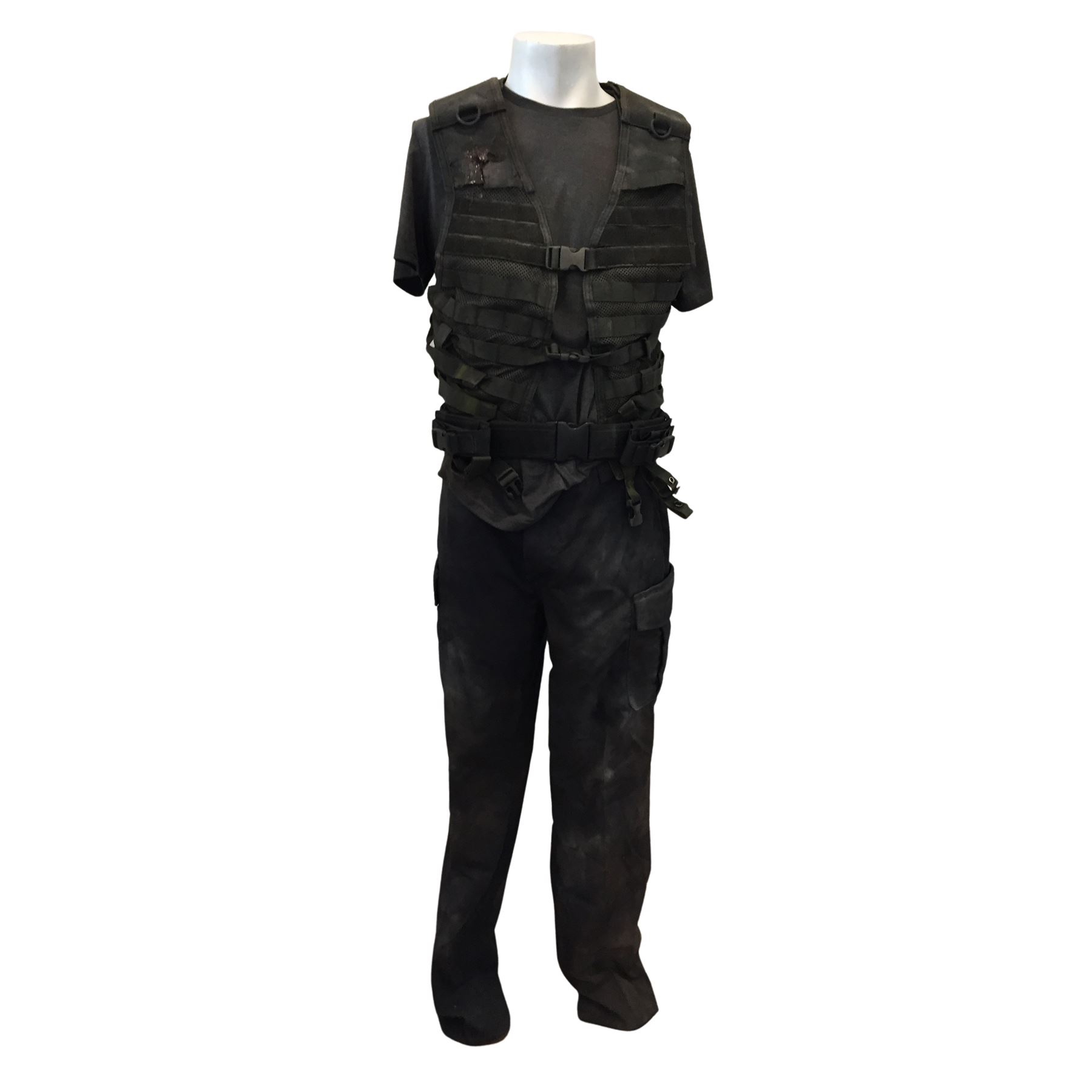 Resident Evil: Welcome to Raccoon City (2021) - Wesker's (Shawn Roberts) screen used, hero, distressed "Without Walls" (m) short sleeve S.T.A.R.S. Raccoon Police Department t- shirt, distressed black utility vest with bloody bullet wound in the right chest , "Blauer" (33r) cargo pants. The entire costume is distressed and production soiled.