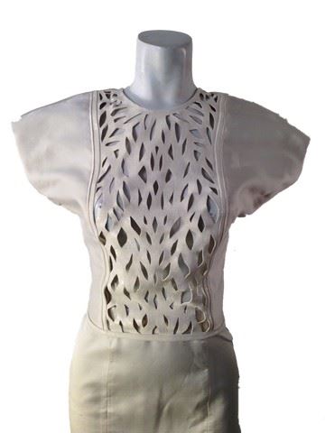 Project Runway All Stars, Season 6, Episode 1: "Rookies vs. Veterans" -Garment # 1 - Designer: Melissa (veteran). Melissa designed a 2- piece cream colored skirt with a leather trim laser cut out crop top.