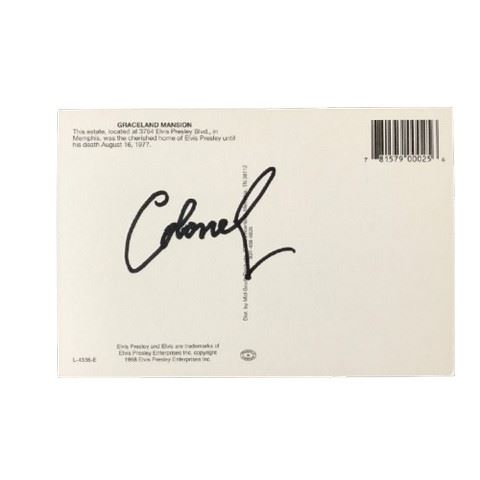 Original, hand signed postcard of Graceland from Colonel Tom Parker (1909-1997) who was the manager of Elvis Presley from 1955 to the day he died in 1977. This comes direct from the collection of Aaron Presley Jr. and was given to him directly from the Colonel. This is the first time anything from his collection has been made available to the public.