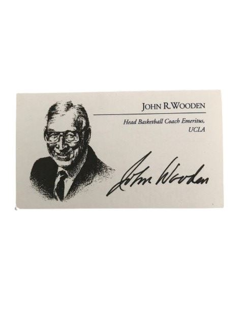 A John Wooden personalized autograph on a pyramid of success motivational poster. Also included is a picture of John Wooden signing this promotional poster for a person named Barry who has kept this in his extensive memorabilia collection. Also includes John Wooden's basketball coach business card.