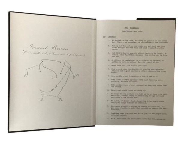 Wooden -Basketball and Beyond book - the official retrospective hardcover book written by Hoffer head coach. The first page includes a copy of the original typed practice note of bullet points that he wrote to his team.