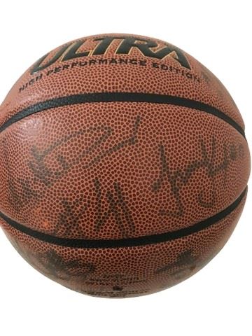 NCAA basketball signed by several players. Wilson composite leather ultra high performance edition. Condition: worn; faded autographs.
