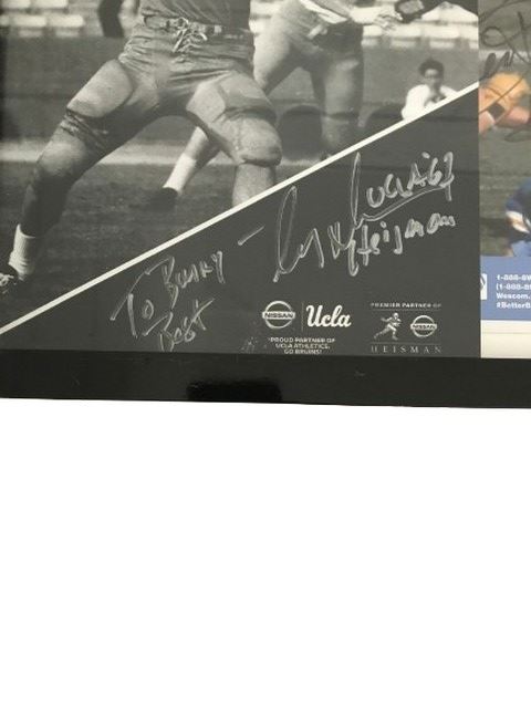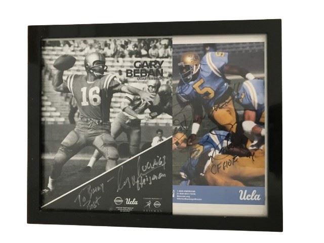 Two posters framed in one frame featuring a black and white photo of Gary Beban the quarterback of UCLA‘s football team who won the Heisman in 1967. Additionally features a color photo of UCLA 1991 Hall of Fame center forward football player #5.