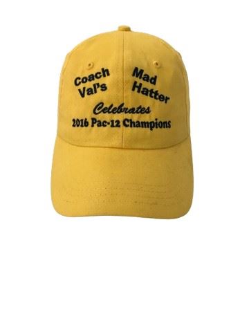 Coach Val’s Mad Hatter celebrates 2016 PAC 12 champions yellow baseball cap with embroidered lettering. Signed by Miss Val and others.