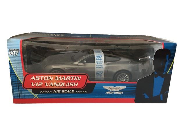 James Bond 007 branded "Die Another Day" Aston Martin V12 Vanquish, 1:18 scale. 2002 The Beanstalk Group, LLC and Danjaq LLC. New in box. Great condition. (13"x7"x5")