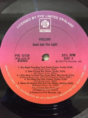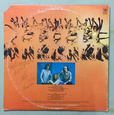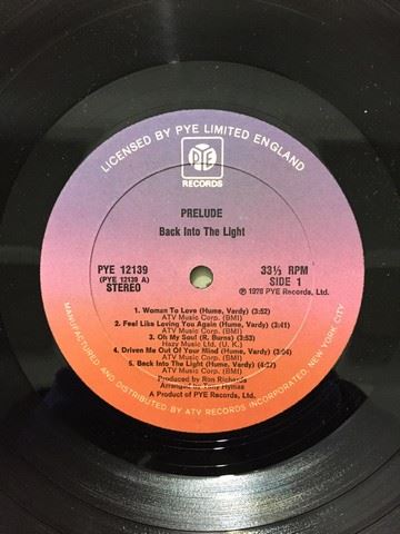 Prelude "Back into the Light" (1976) vinyl record. Ten songs between both sides. Songs include "Woman to Love"; "Oh My Soul", "Take it From Me", etc. Autograph is written on the back with a personal message stating "To: Al (Our favorite all night man) Enjoy! March 1979".
