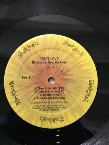 "First Love, Nothing Can Keep Me Away" (1981) autographed vinyl record. 9 songs between both sides. Songs include "Closer to the Light", "Give It All Up", "Raise a Praise", etc. Autographs from all members of First Love are written on the back cover.