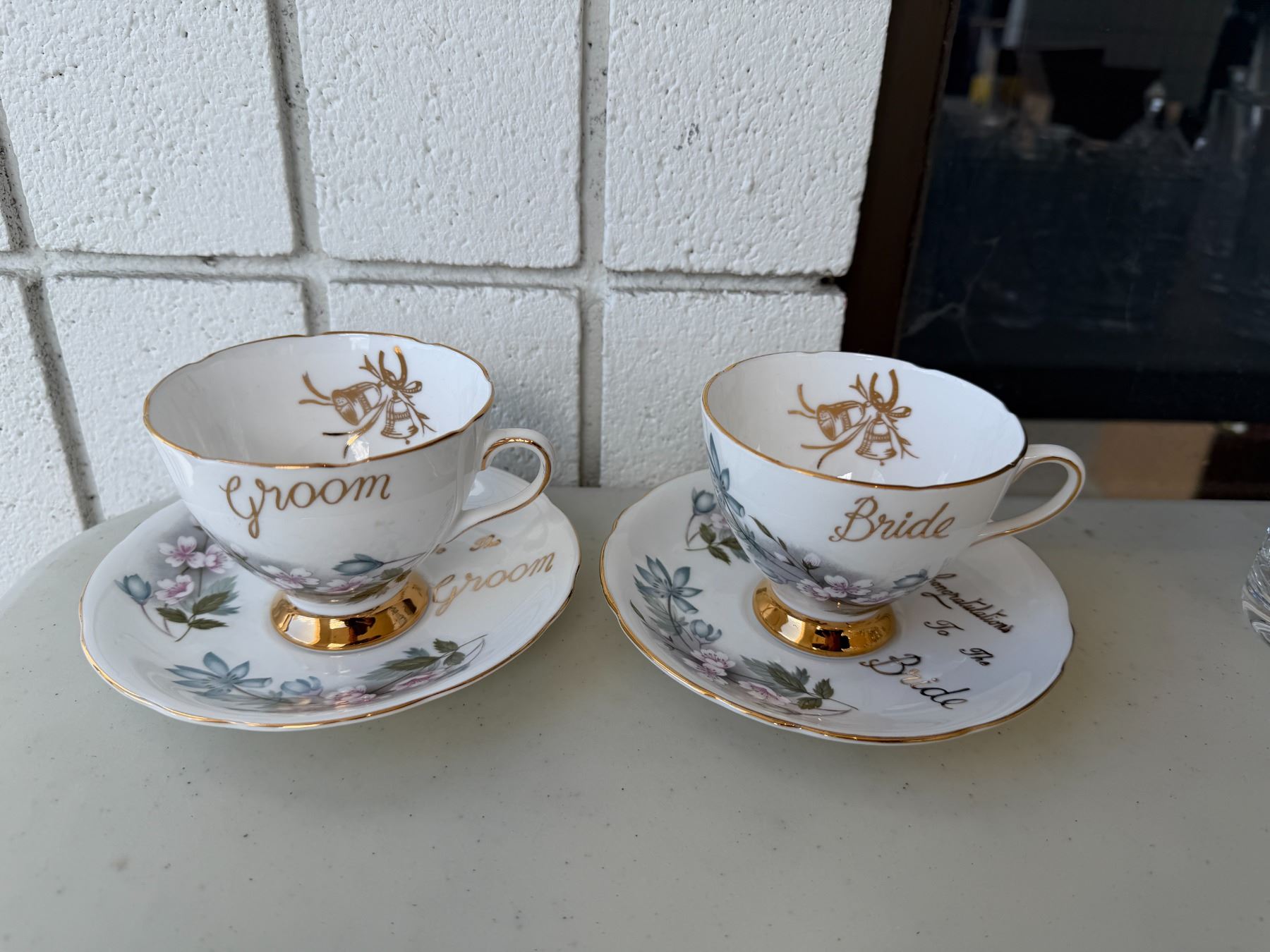 Lot 613 Bride and groom, Gladstone, teacup, and saucers
