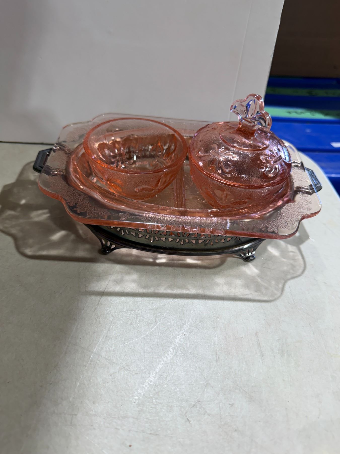 Pink depression, glass, serving dishes, and stand