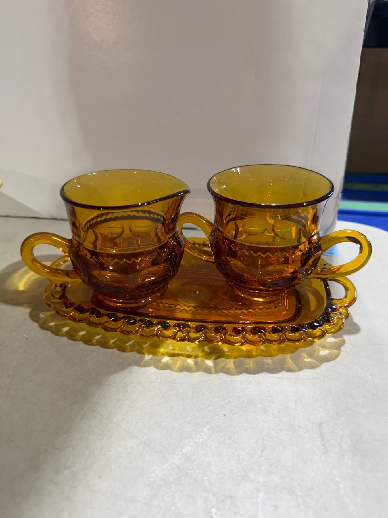 Indiana Glass Company creamer, sugar bowl, and tray set in the amber "Kings Crown" thumbprint pattern