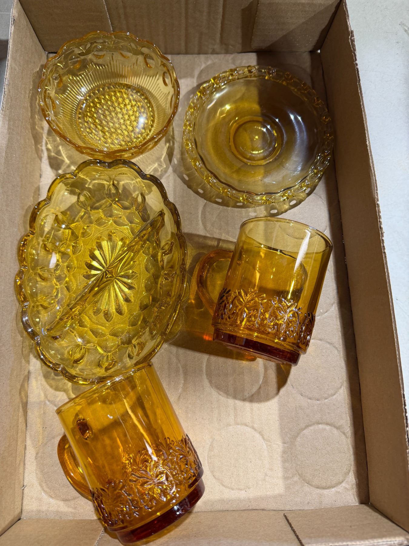 amber-colored glass items are vintage pieces from the Indiana Glass Company