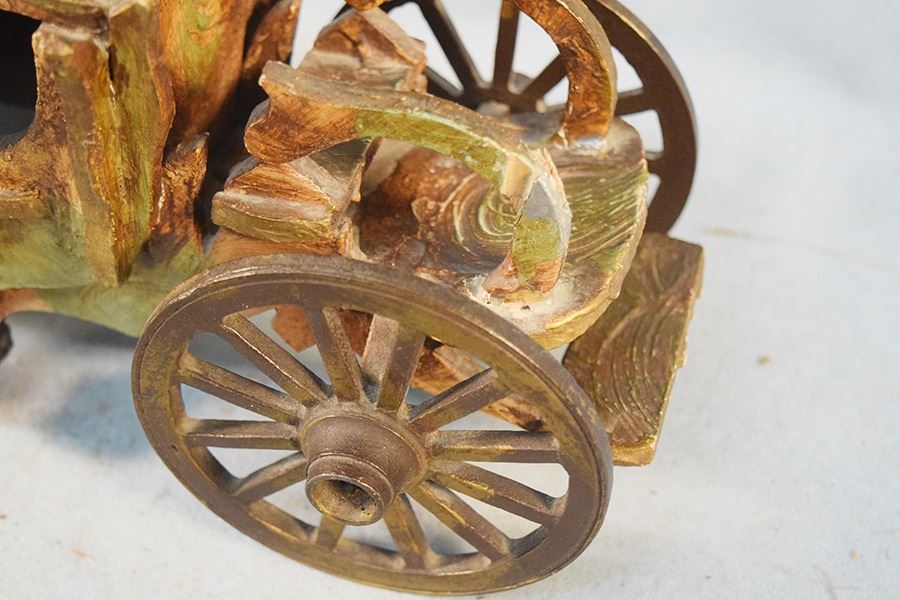 Vintage wooden stage coach with metal wheels and axles, 15" x 8" x 5"