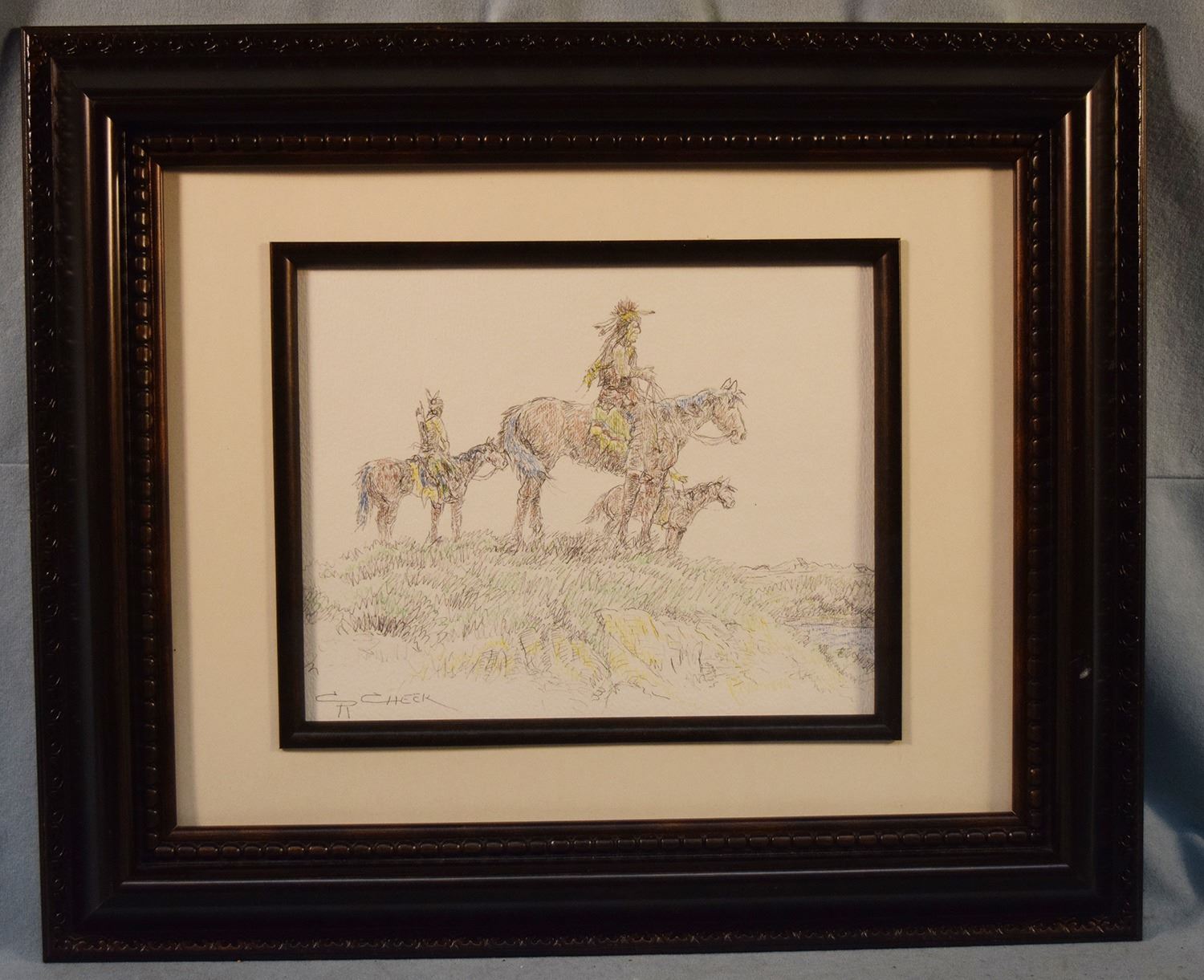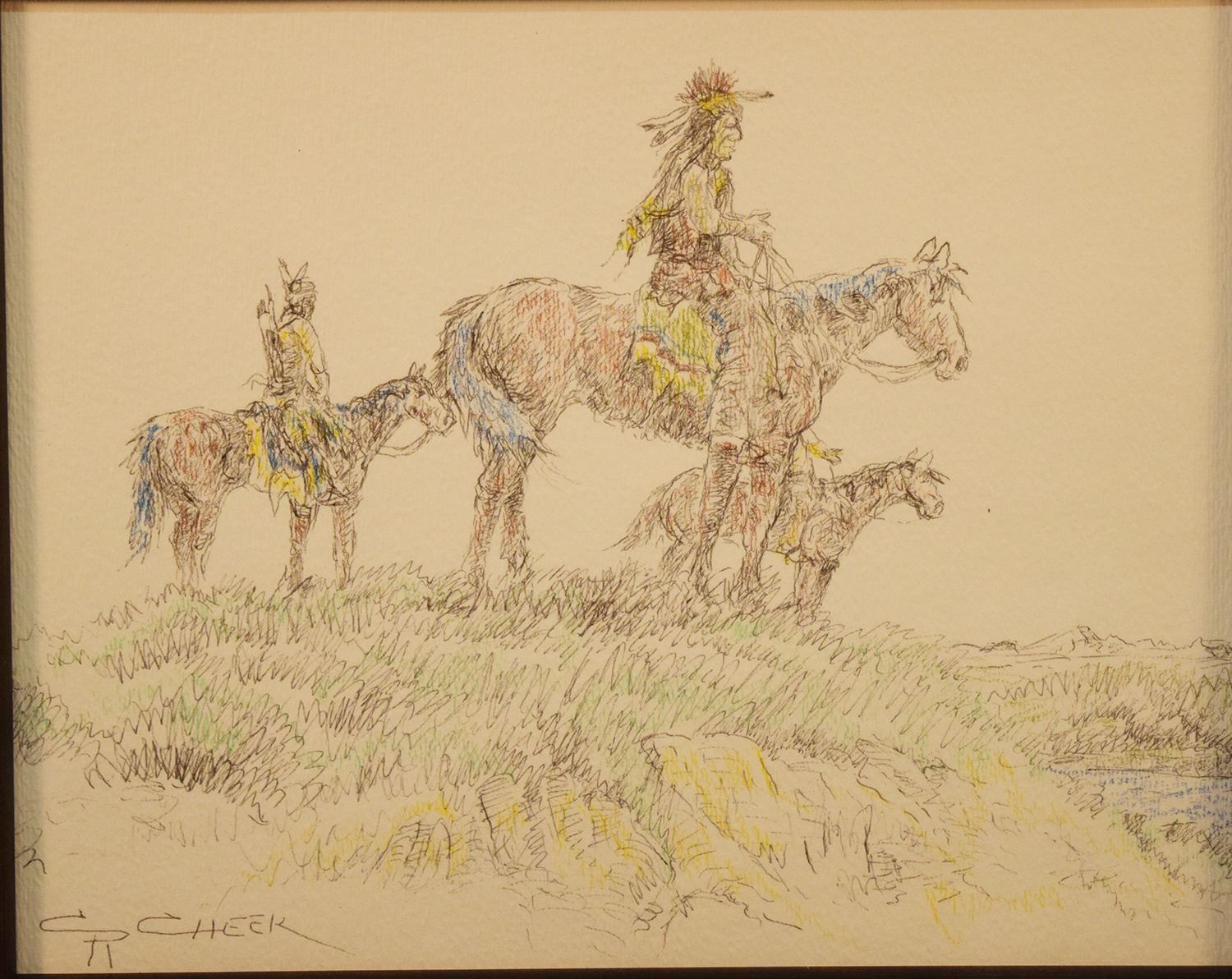 Cheek, C. R., original pen & ink, Indians Horseback, 7.5" x 9.5", framed, signed lower left