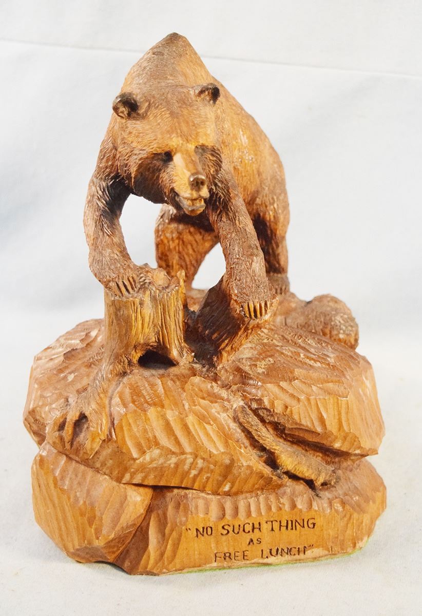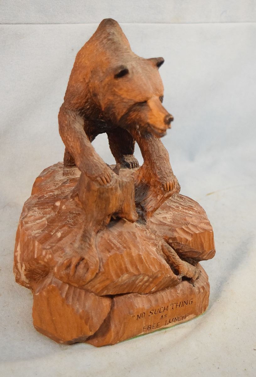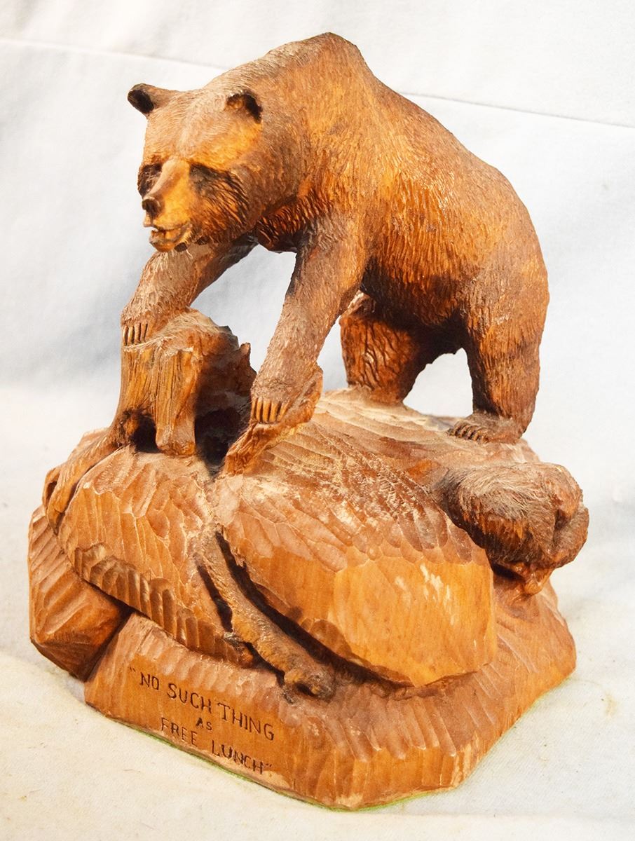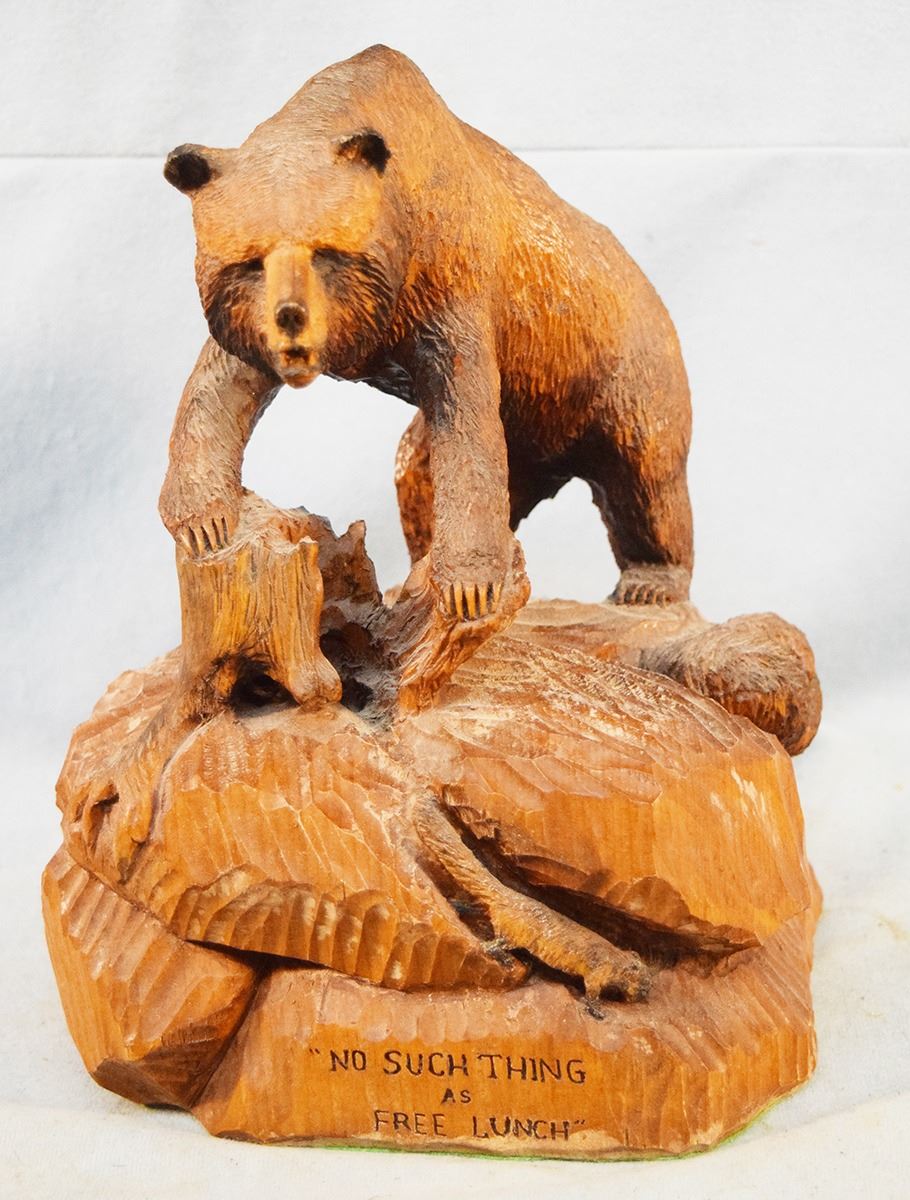 Latum, wood carving, No Such Thing As A Free Lunch, hand carved grizzly bear, 9" tall, 8 1/2" wide at the base.