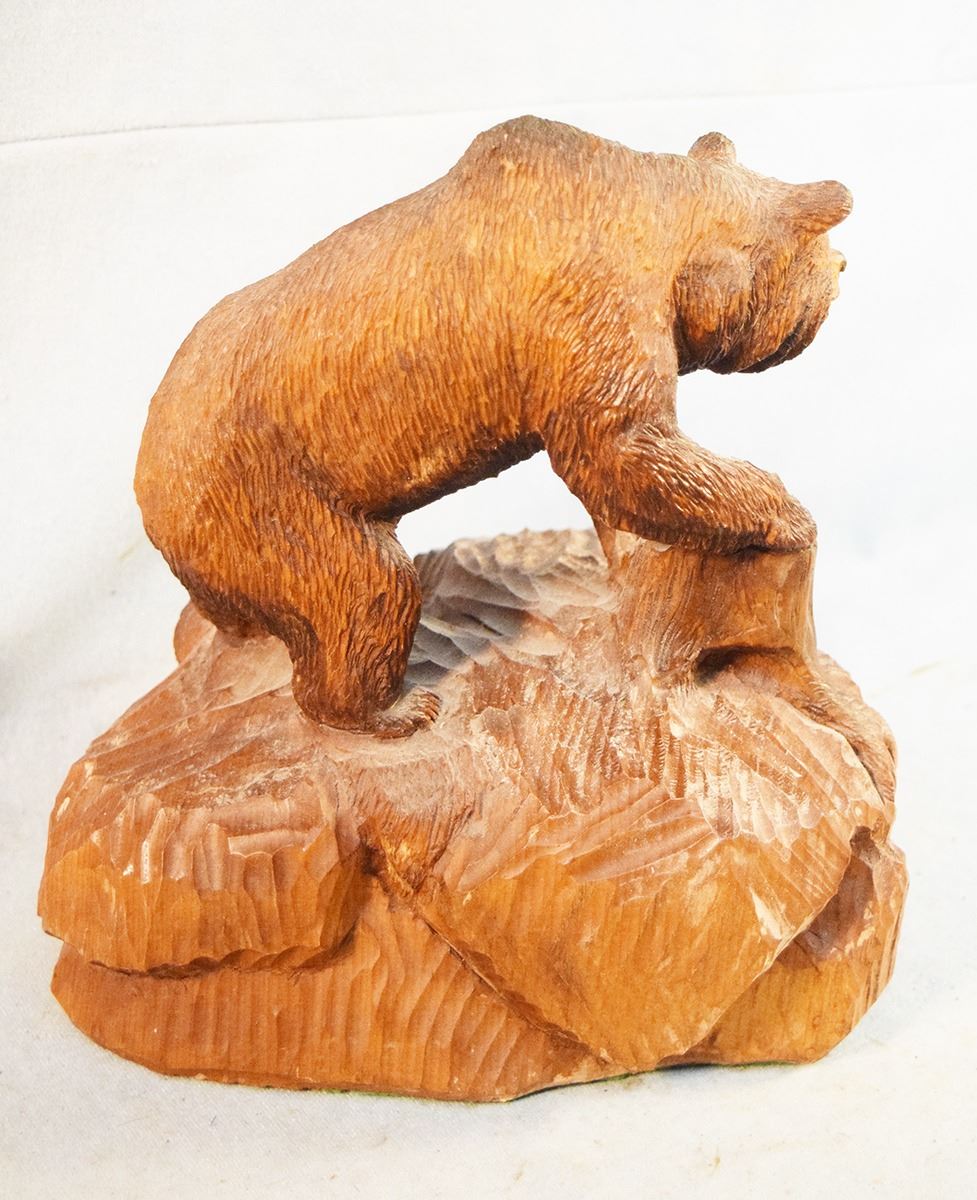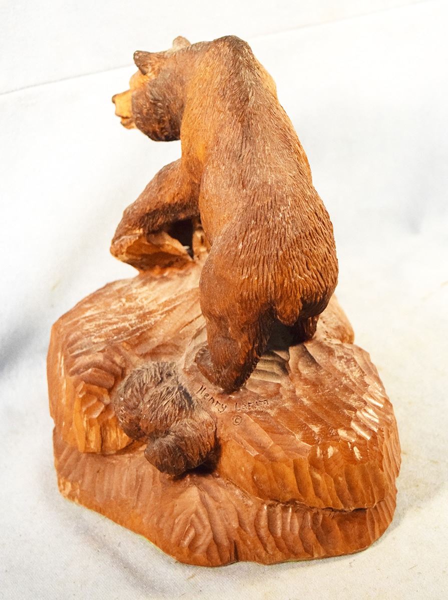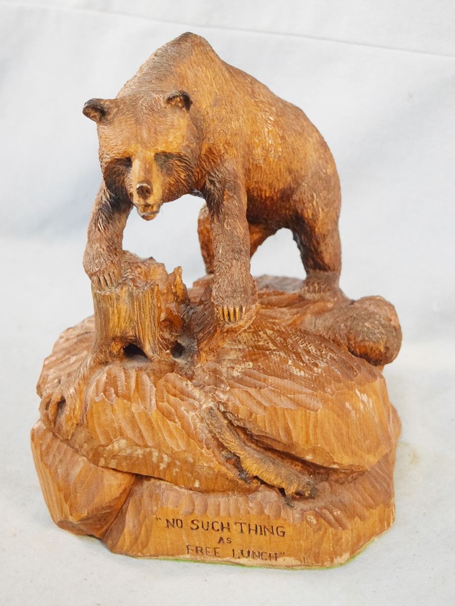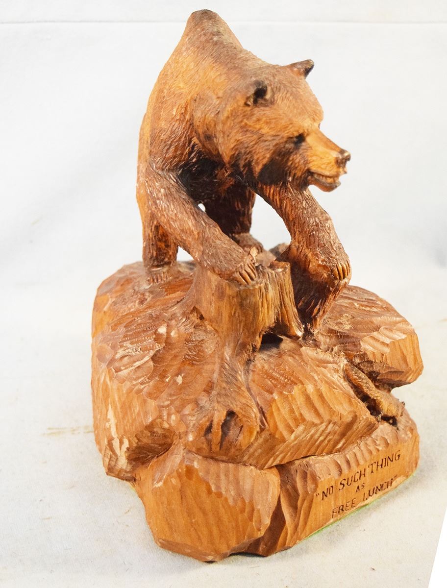Latum, wood carving, No Such Thing As A Free Lunch, hand carved grizzly bear, 9" tall, 8 1/2" wide at the base.