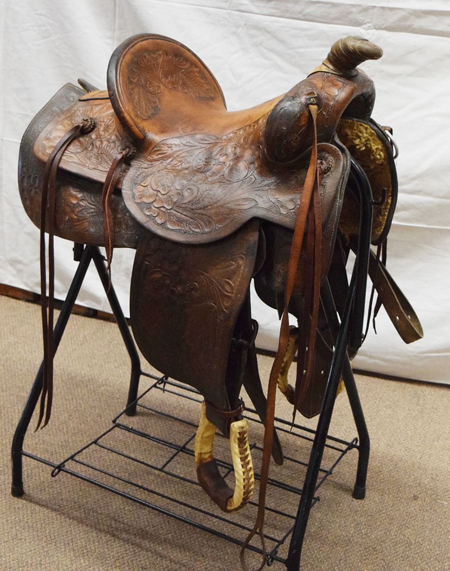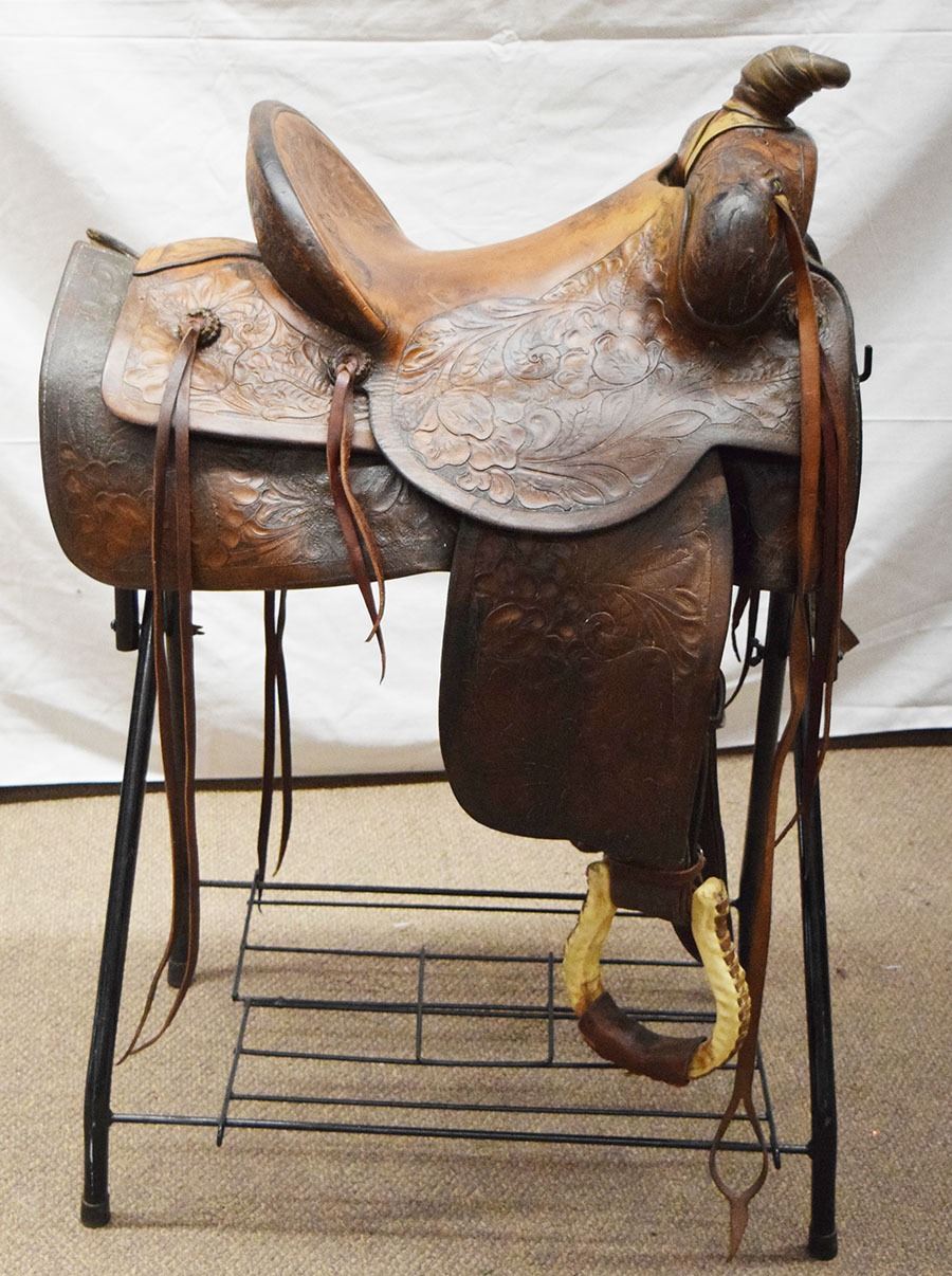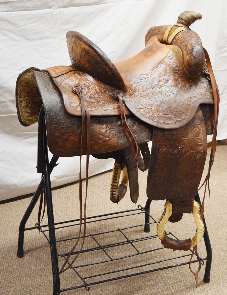 Buck & Knapp, Helena, MT, 14" western saddle, square skirt, flower tooled, single rigged, oxbows, fleece is rough