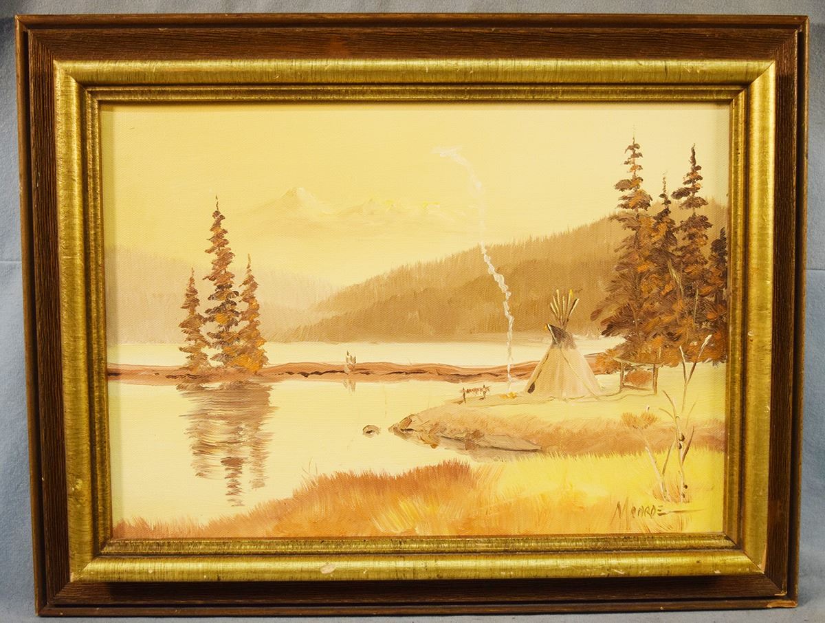 Monroe, Bob, original oil on canvas, Fall Teepee Camp, 1983, 10" x 14", framed, signed lower right
