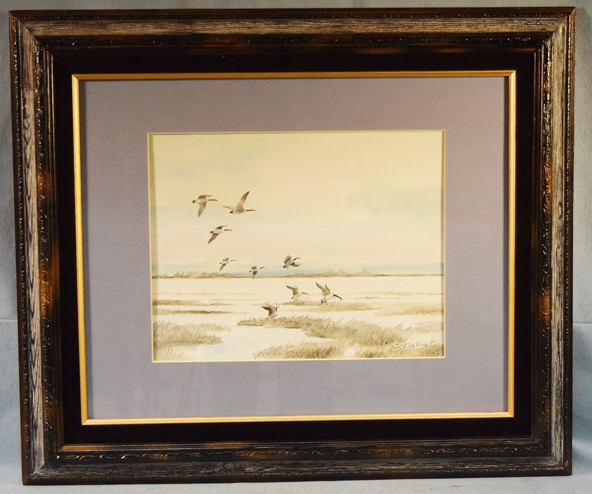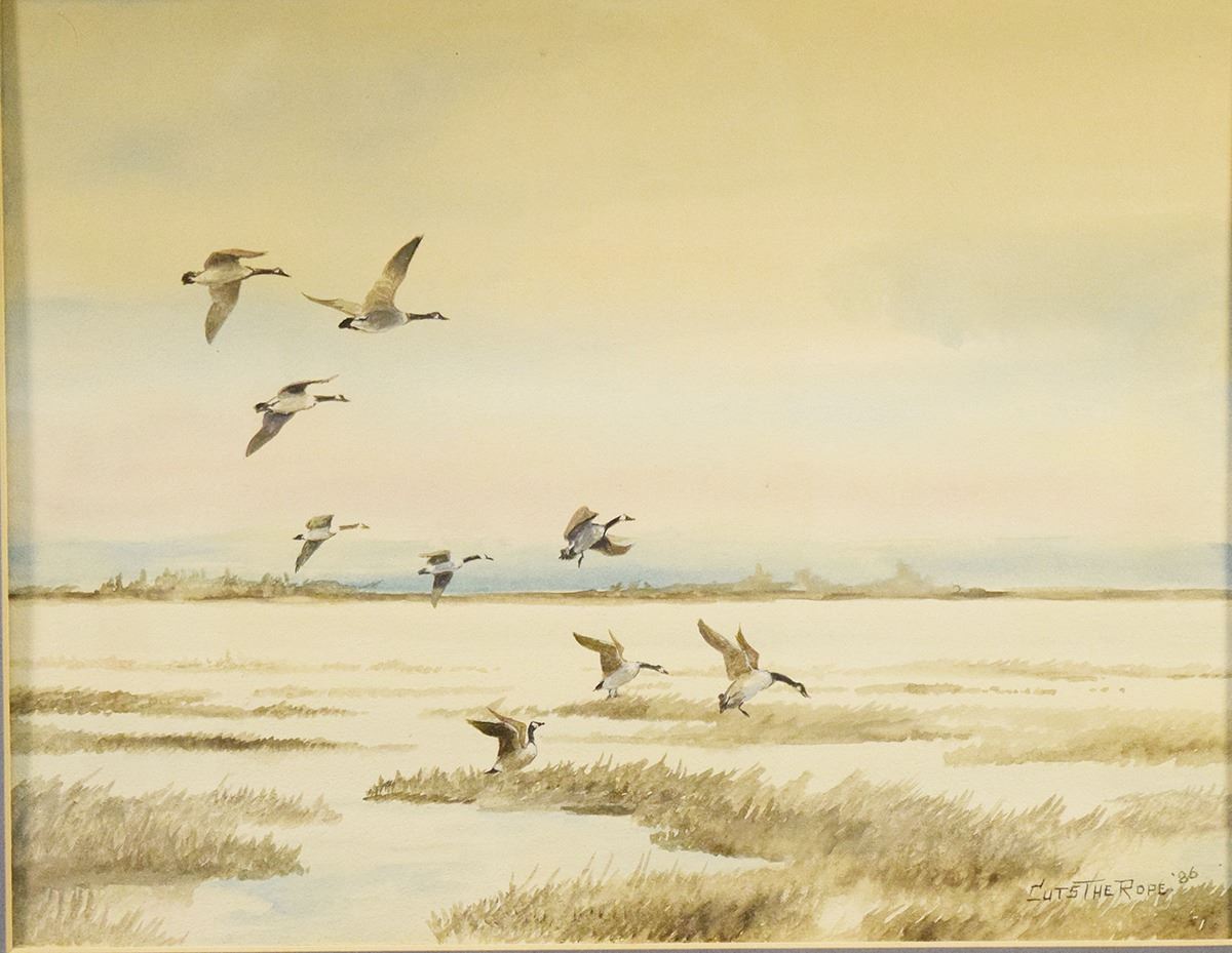 Cuts the Rope, Clarence, original water color, Geese Landing, 1986, 10.5" x 13.5", framed, signed lower right